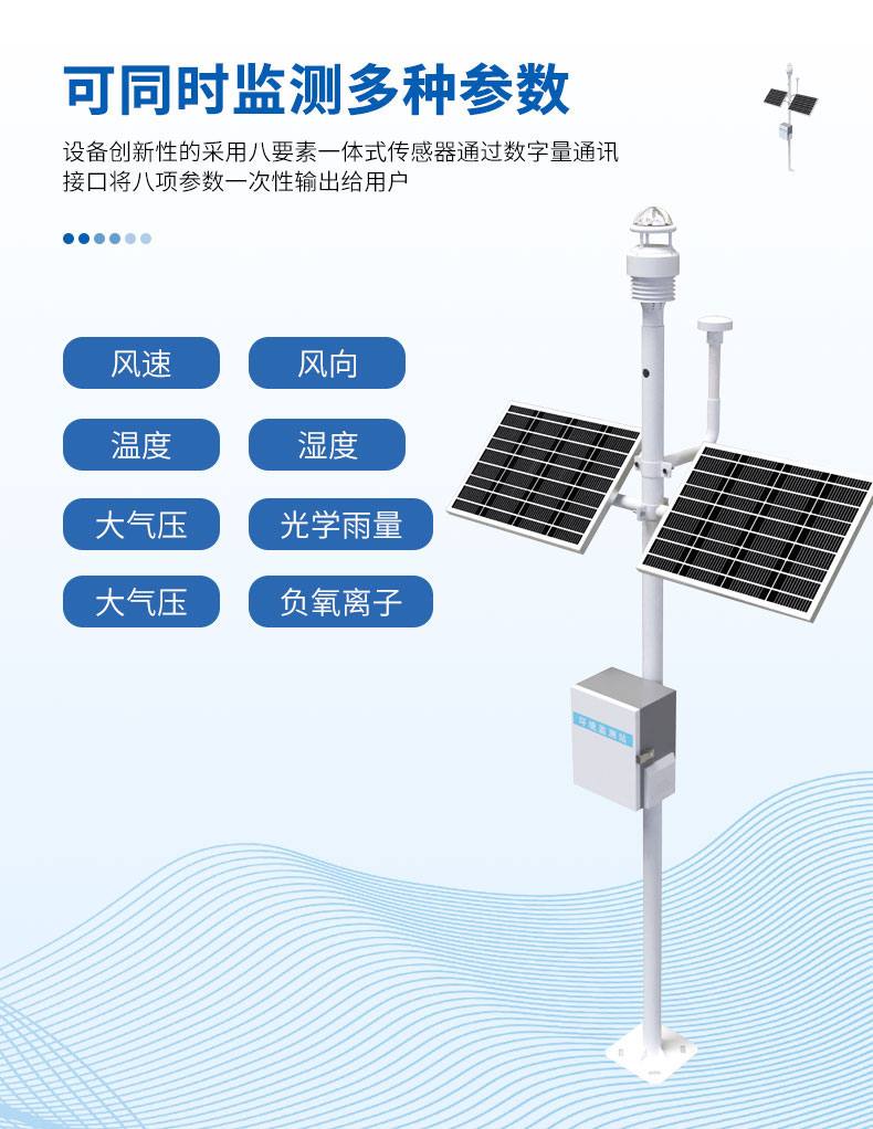 与传统的超声波气象站相比,我司产品克服了对高精度计时器的需求,避免了因传感器启动延时、解调电路延时、温度变化而造成的测量不准问题。该设备创新性的采用八要素一体式传感器,可对超声波风速风向、温度、湿度、大气压、光学雨量、总辐射、负氧离子等气象要素进行实时观测,可实现户外气象参数24小时连续在线监测,通过数字量通讯接口将八项参数一次性输出给用户。