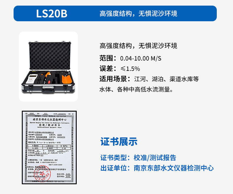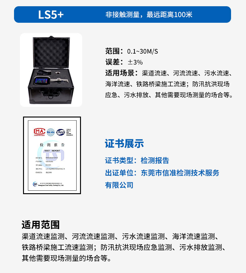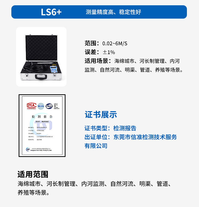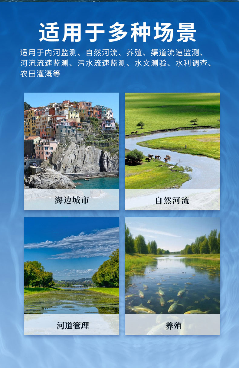 该流速仪广泛适用于水文测验、水利调查、农田灌溉、径流实验等,亦可适用于水电、环保、矿山、交通、地质、科研院所、市政等行业进行相关流速或流量的监测。