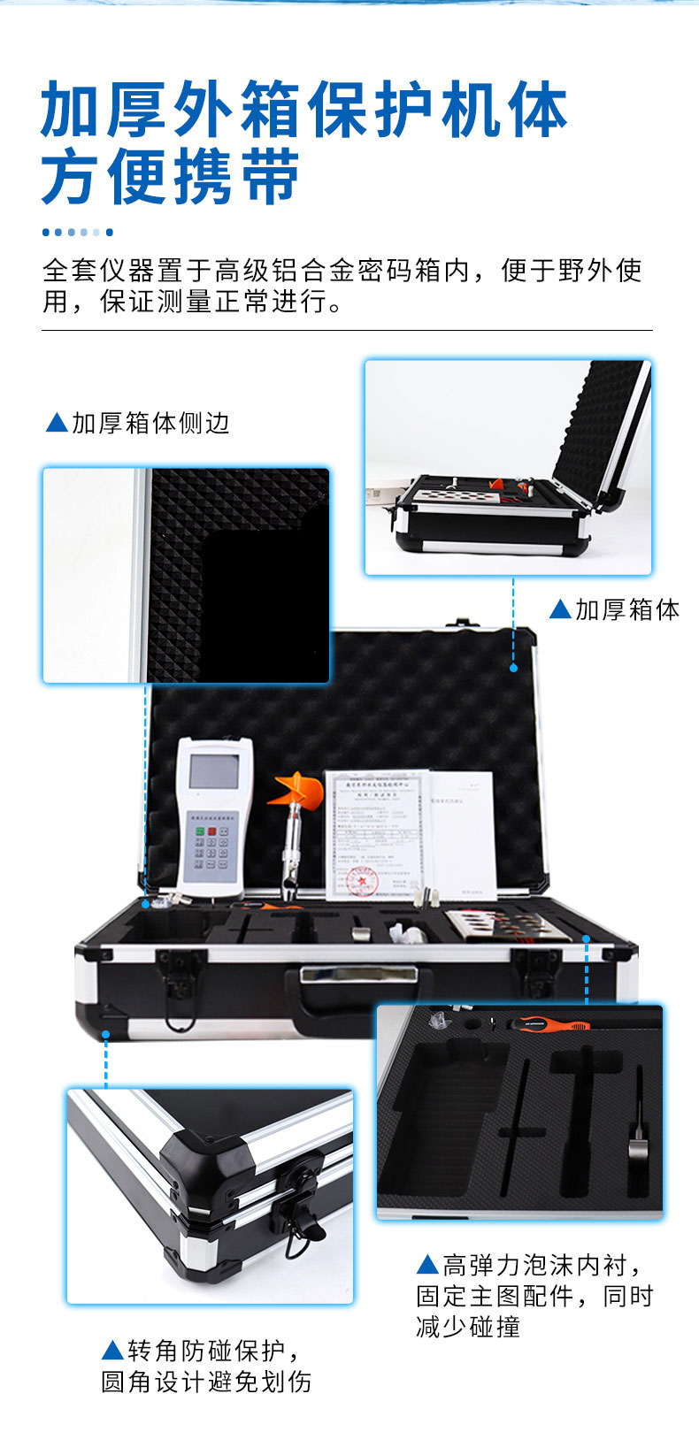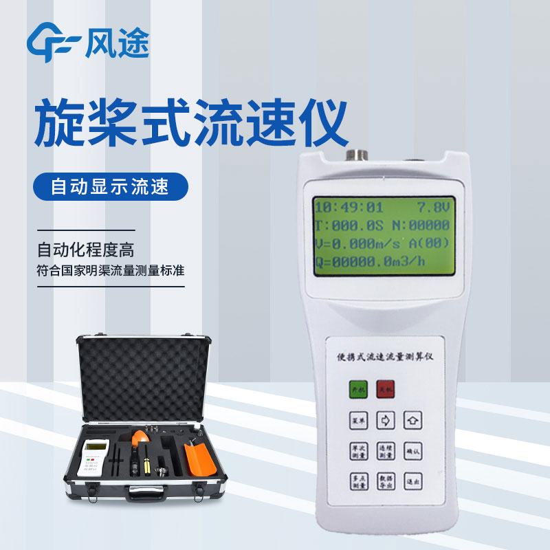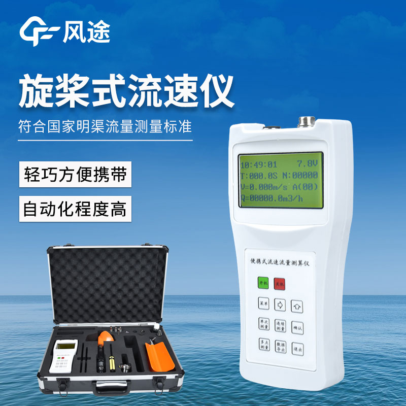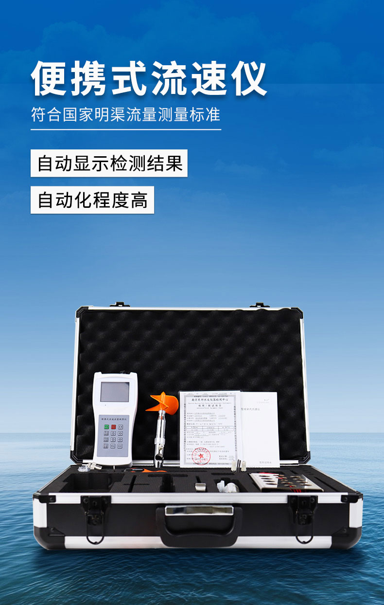 便携式流速仪主要由旋桨式流速传感器、流速测算仪、测杆组成。全套仪器置于高级铝合金密码箱内。接通信号线,即可进行各明渠中流速的测量,并自动显示流速。