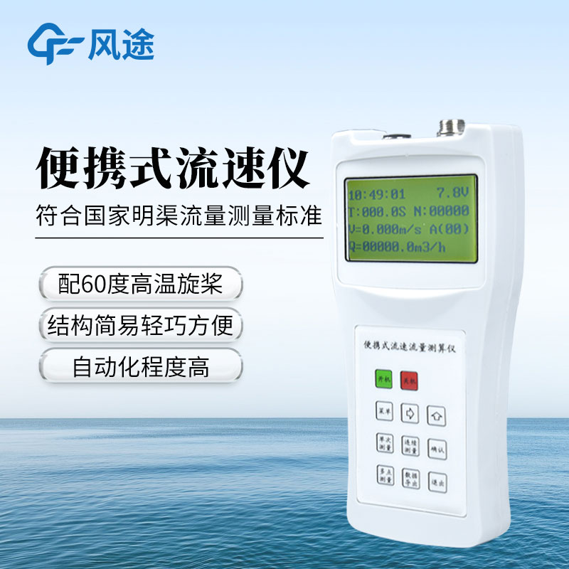 便携式流速仪主要由旋桨式流速传感器、流速测算仪、测杆组成。全套仪器置于高级铝合金密码箱内。接通信号线,即可进行各明渠中流速的测量,并自动显示流速。