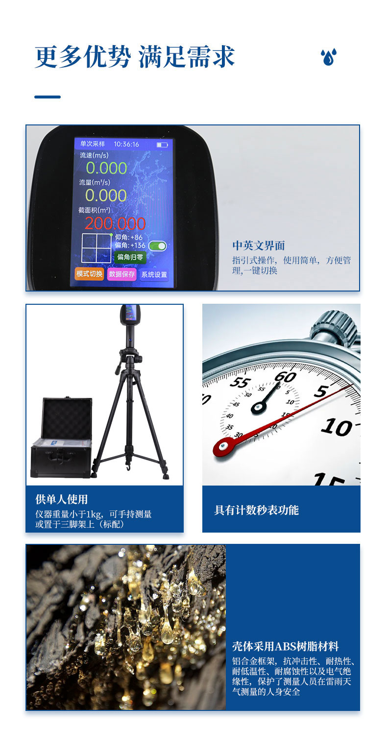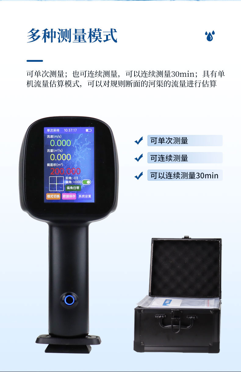 5.多种测量模式,可单次测量;也可连续测量,可以连续测量30min;具有单机流量估算模式,可以对规则断面的河渠的流量进行估算;
