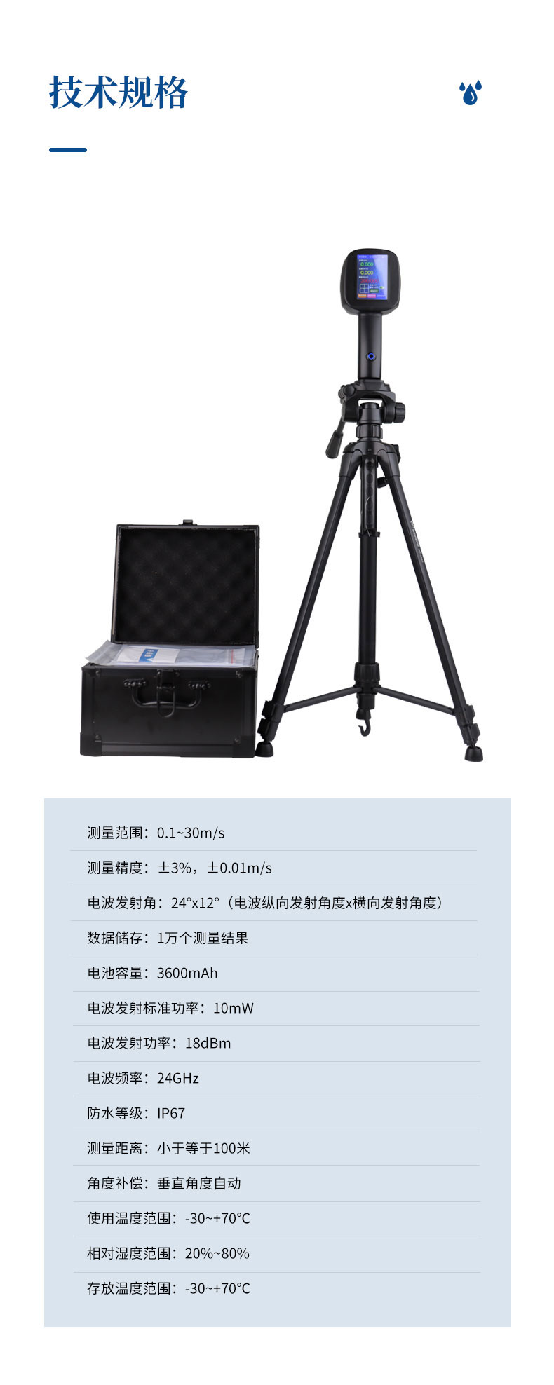 【产品简介】一、电波流速仪产品简介:手持式电波(雷达)流速仪,该仪器采用K波段雷达对河流、污水、泥浆、海洋进行非接触式的流速测量。具有体积小巧、手持式操作、电池供电、使用简便的特点。使用中不受···