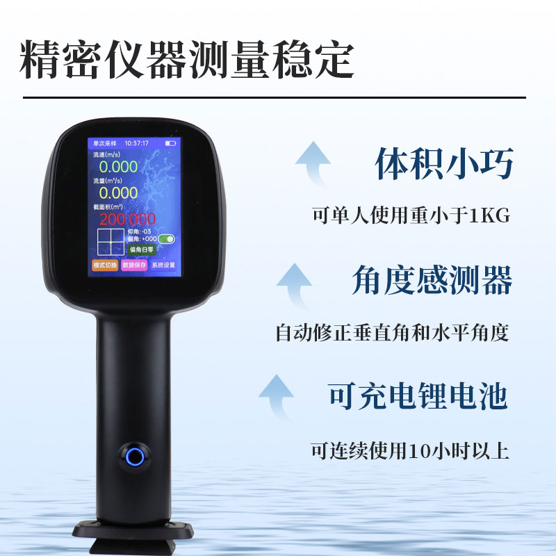 手持式电波(雷达)流速仪,该仪器采用K波段雷达对河流、污水、泥浆、海洋进行非接触式的流速测量。具有体积小巧、手持式操作、电池供电、使用简便的特点。使用中不受污水腐蚀、不受泥沙干扰,并可在小于等于100米的测量范围内进行非接触测量,确保了测量者的安全。仪器包括一个高敏感度的平面窄带雷达探头和角度计,无需任何设置,一键操作即可实现水平和垂直角度的自动校正和流速的修正测量,使用非常便捷。