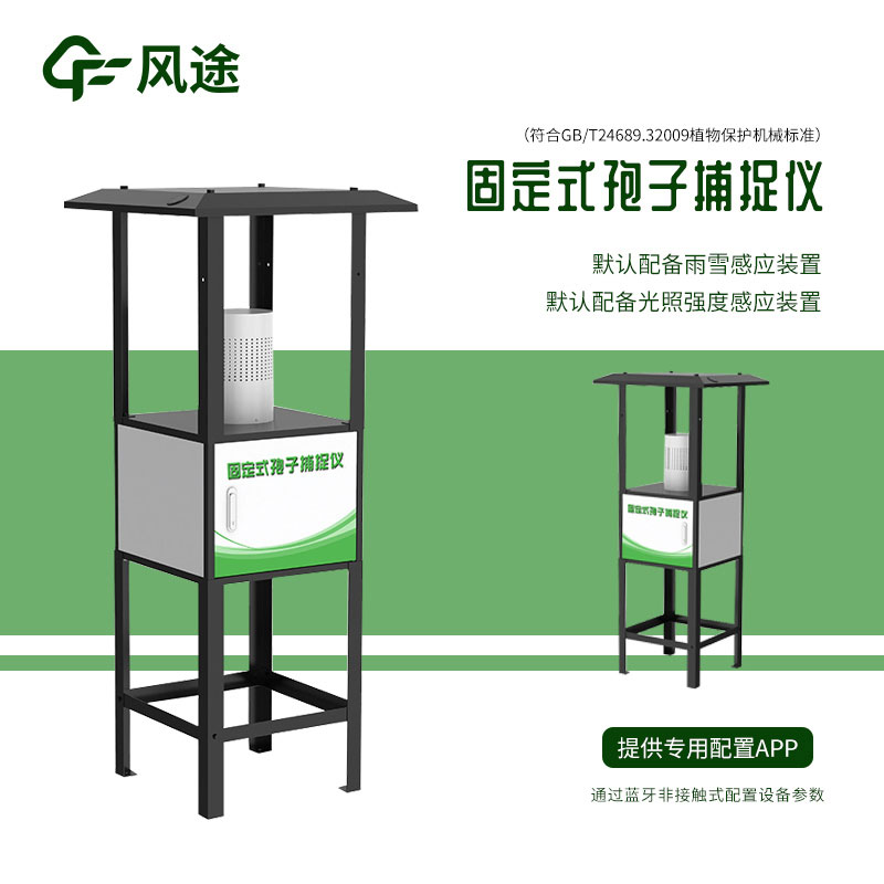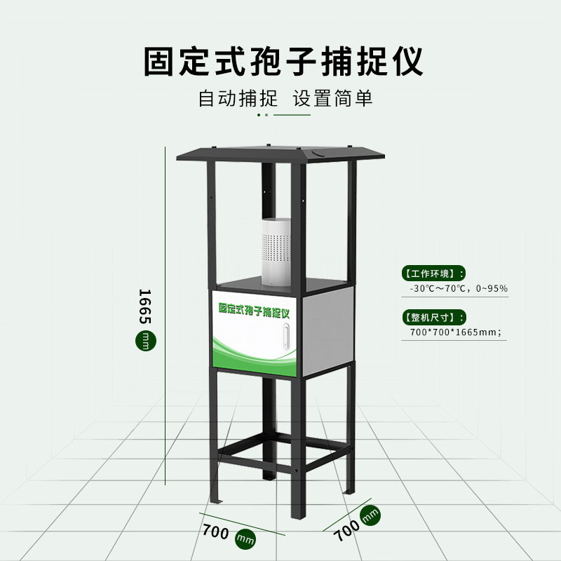固定式孢子捕捉仪主体结构:主体采用喷塑金属材质,由防雨上盖、过滤网、主箱体、底部支架组成。