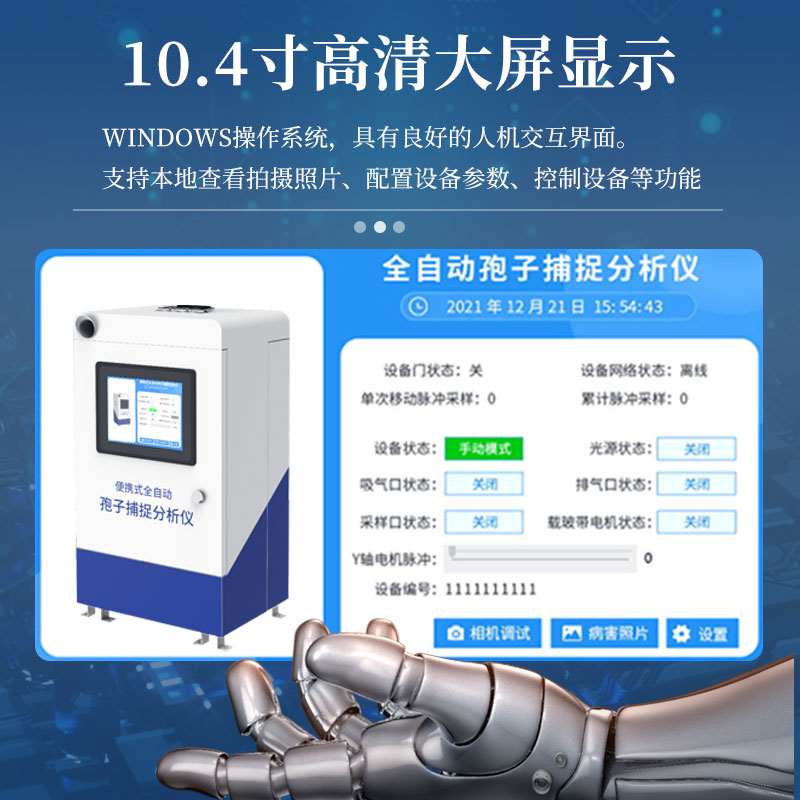 8.孢子捕捉仪内置10.4寸高清大屏显示,windows操作系统,具有良好的人机交互界面。支持本地查看拍摄照片、配置设备参数、控制设备等功能