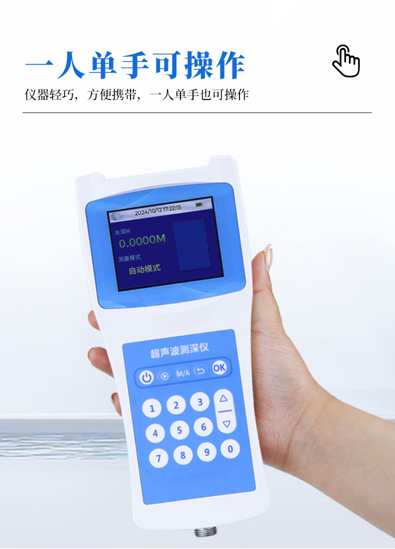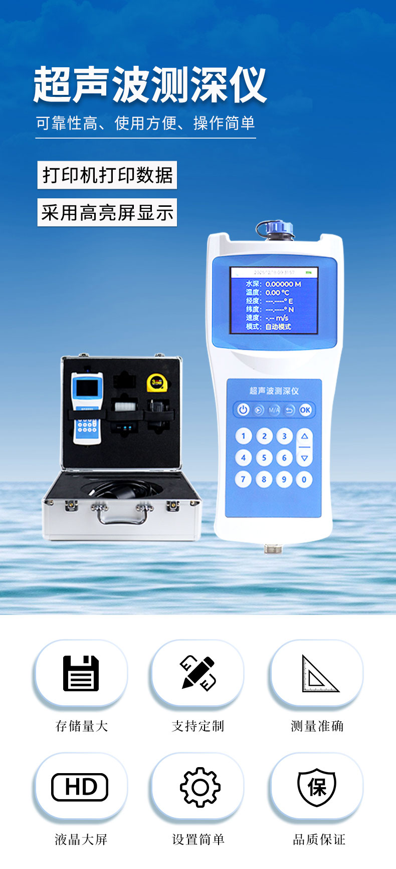 高精度多功能超声波测深仪是测量水库、湖泊、江河、浅海等水体的便携式测深仪,测深时将超声波换能器置于水面下一定位置,利用超声波在水中的固定声速VC和超声波发射到接收的时间T,仪器自动换算出水深H。本品是我司积累多年生产经验,吸取了多种同类产品优点,而开发的一款方便适用的手持式超声波测距仪表。超声波收发转换电路采用专用大规模集成电路,元件贴片率99%,并以液晶显示测深结果,保证了产品的长期可靠性,同时将其功耗降到了极低。具有测量精确、功耗低、可靠性高、使用方便、操作简单、测量速度准确、携带方便等优点。仪器可在静水中测深,也可在具有一定速度的水中测深;水流速度≤5m/秒,是水文测验、水电厂库区、湖泊、河道勘测和环境水域监测的理想水深测量仪器。