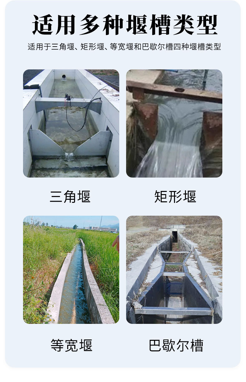 1、适用于三角堰、矩形堰、等宽堰和巴歇尔槽四种堰槽类型;