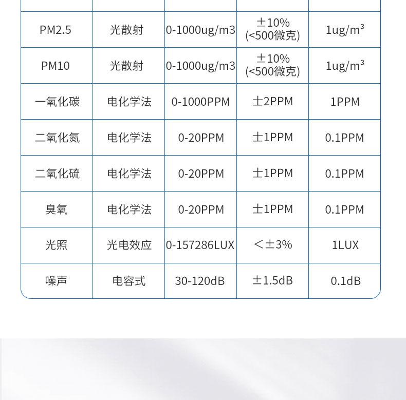 7.PM2.5:测量原理光散射,0-1000ug/m3(±10%(<500微克)),分辨率1ug/m³;