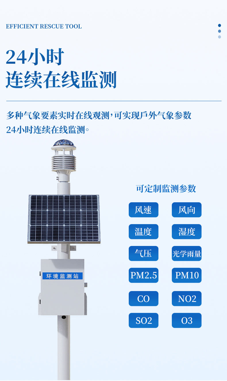 该设备创新性的采用十二要素一体式传感器,可对风速、风向、温度、湿度、气压、光学雨量、pm2.5、pm10、CO、NO2、SO2、O3等气象要素进行实时观测,可实现户外气象参数24小时连续在线监测,