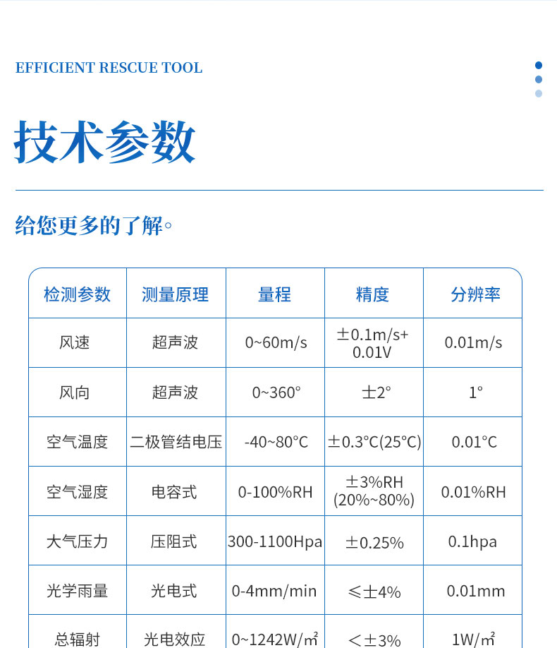 1.风速:测量原理超声波,0~60m/s(±0.1m/s+0.01V)分辨率0.01m/s;