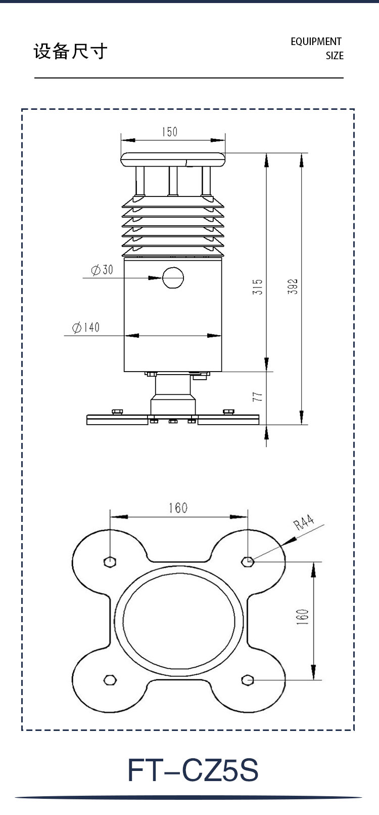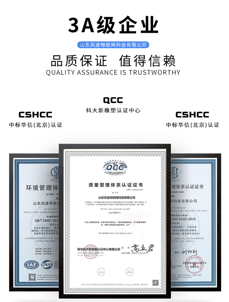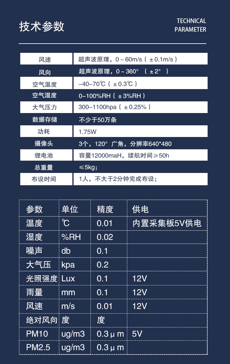 该设备采用五要素一体式传感器,可对风速、风向、空气温度、湿度、大气压力等气象要素进行实时观测,传感器外壳采用进口ABS材质,更有效对抗盐雾等环境,防护等级达到IP65以上。