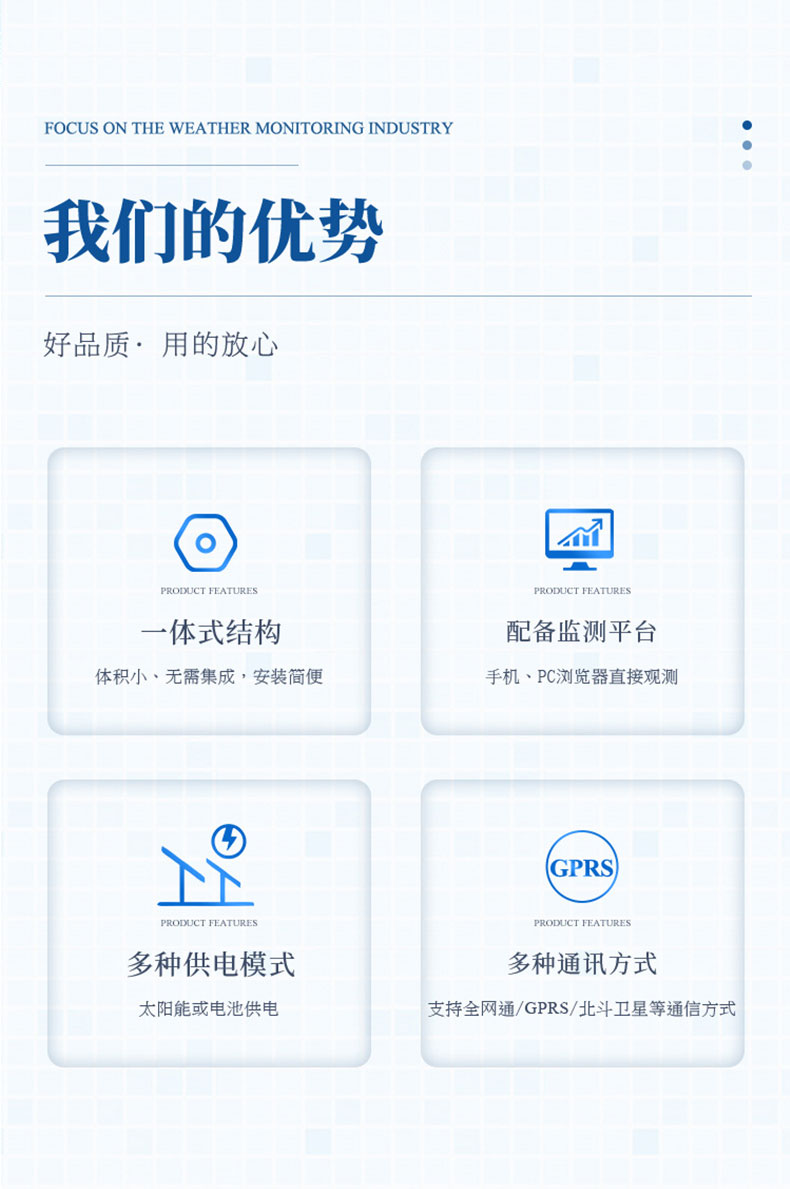 远程监测设备:即遥控监测终端,负责采集现场检测设备检测到的数据信息,并通过无线传输将现场信息传送给监测中心。