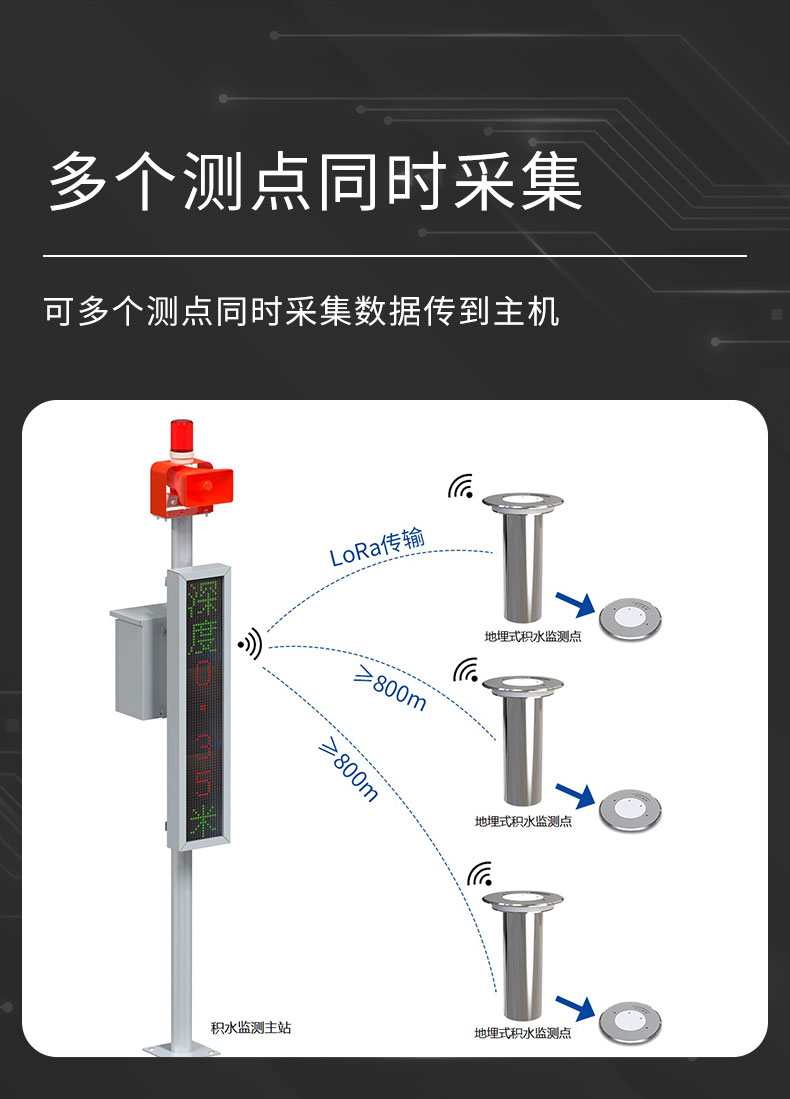 通讯接口:采用semtech公司开发的一种低功耗局域网无线标准—LORA无线通信,此通信方式实现了低功耗和远距离的统一。搭配我司独有的LORA无线通信协议与我司积水监测站主机进行无线远距离通信,通信视距可达800m。