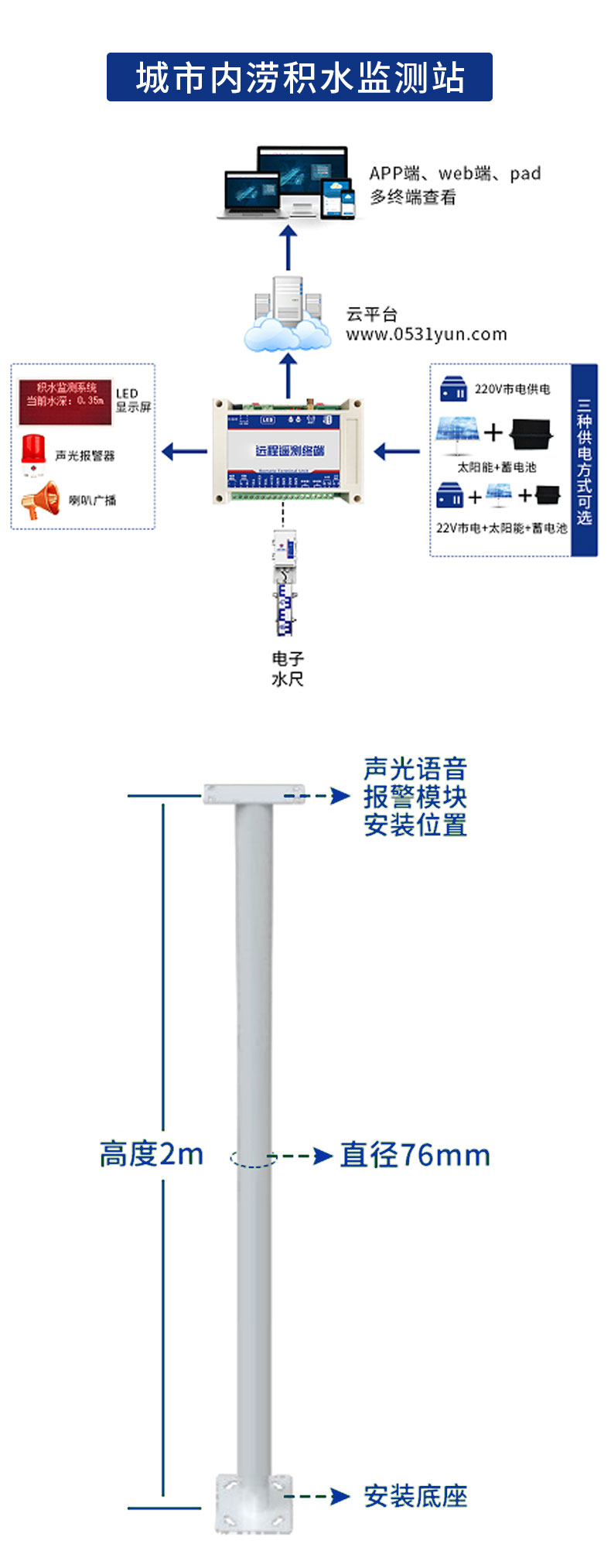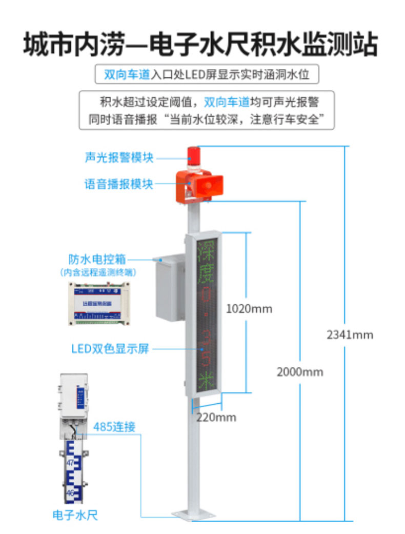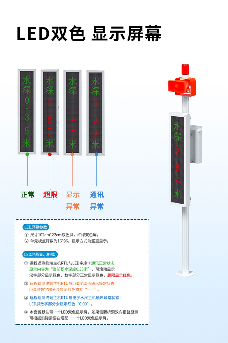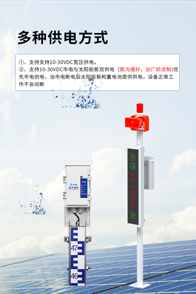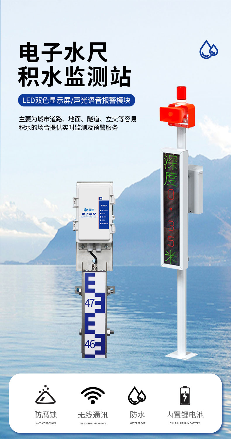 【产品简介】积水监测站电子水尺【设备组成】:电子水尺主机+水尺节【工作原理】:利用水的微弱导电性原理,使用先进的处理器芯片做为控制器,通过测量电极获取水位数据,经CPU数字编码、分度、采样、数···