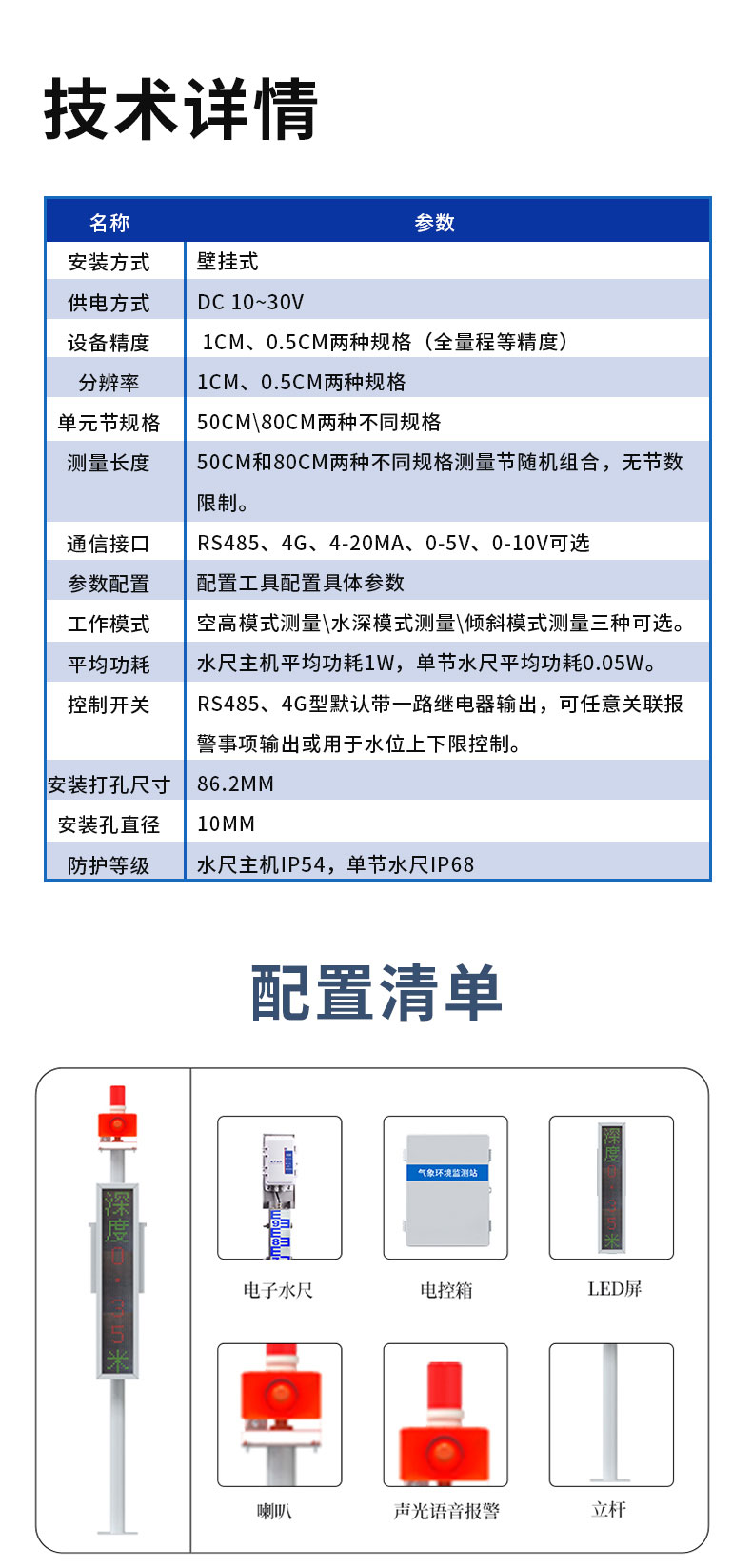 【防护等级】:水尺主机IP54,单节水尺IP68