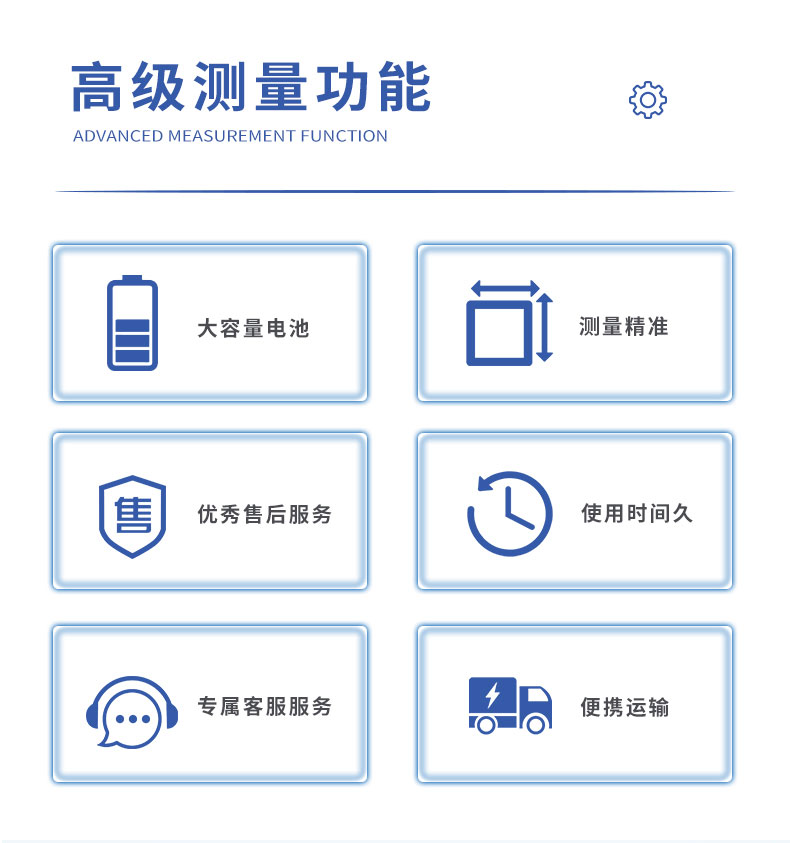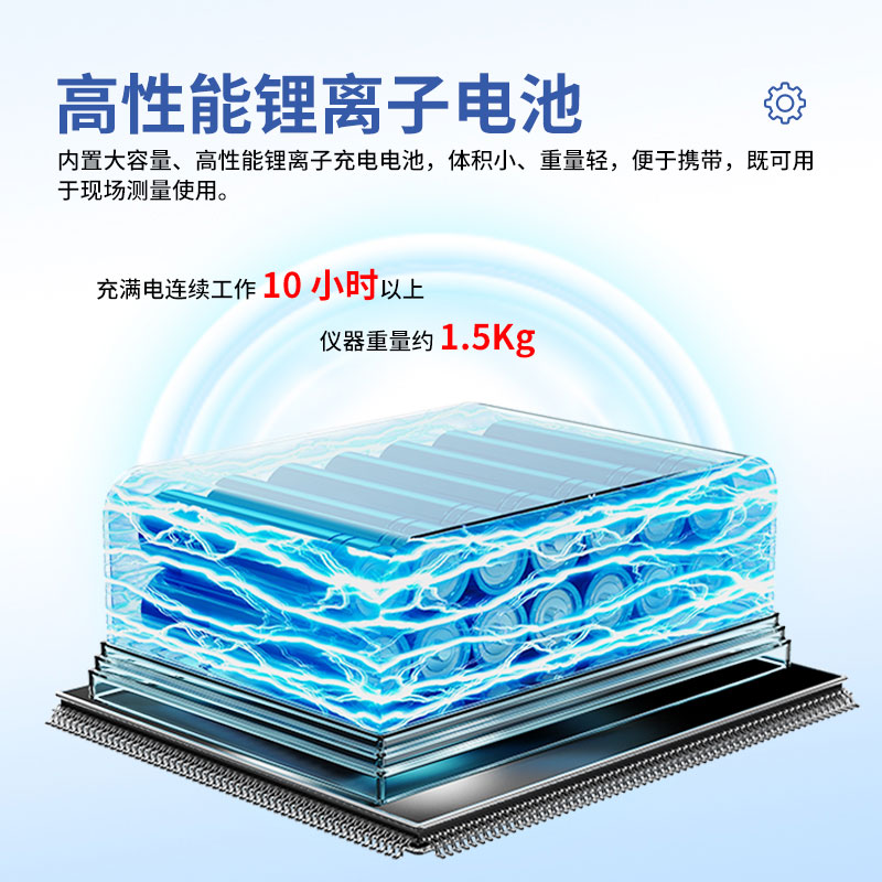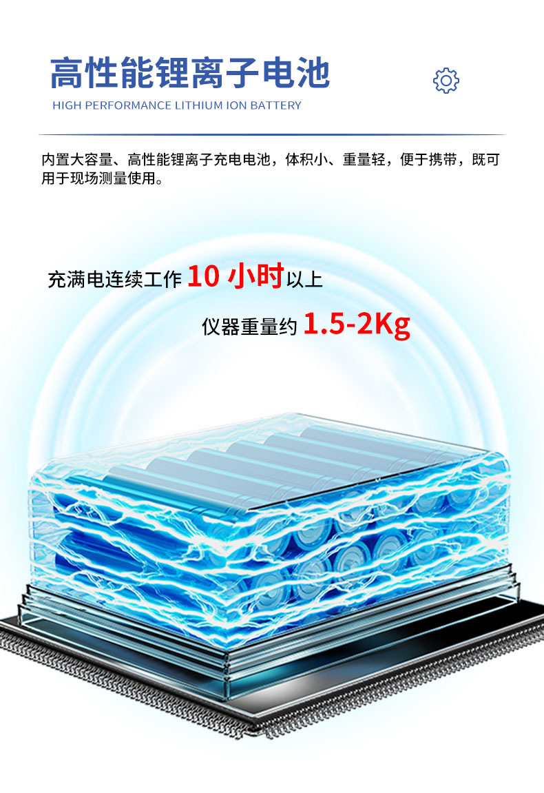 22.内置大容量、高性能锂离子充电电池,充满电连续工作10小时以上。23.体积小、重量轻,便于携带,既可用于现场测量使用,也可用做实验室的标准计量设备。