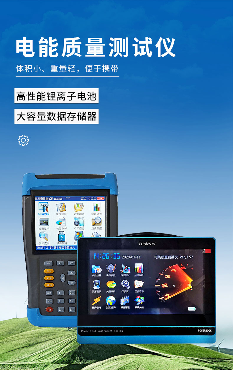1.仪器是专门用于检测电网中发生波形畸变、谐波含量、三相不平衡等电能质量问题的高精度测试仪器;同时还具备电参量测试、矢量分析的功能。
