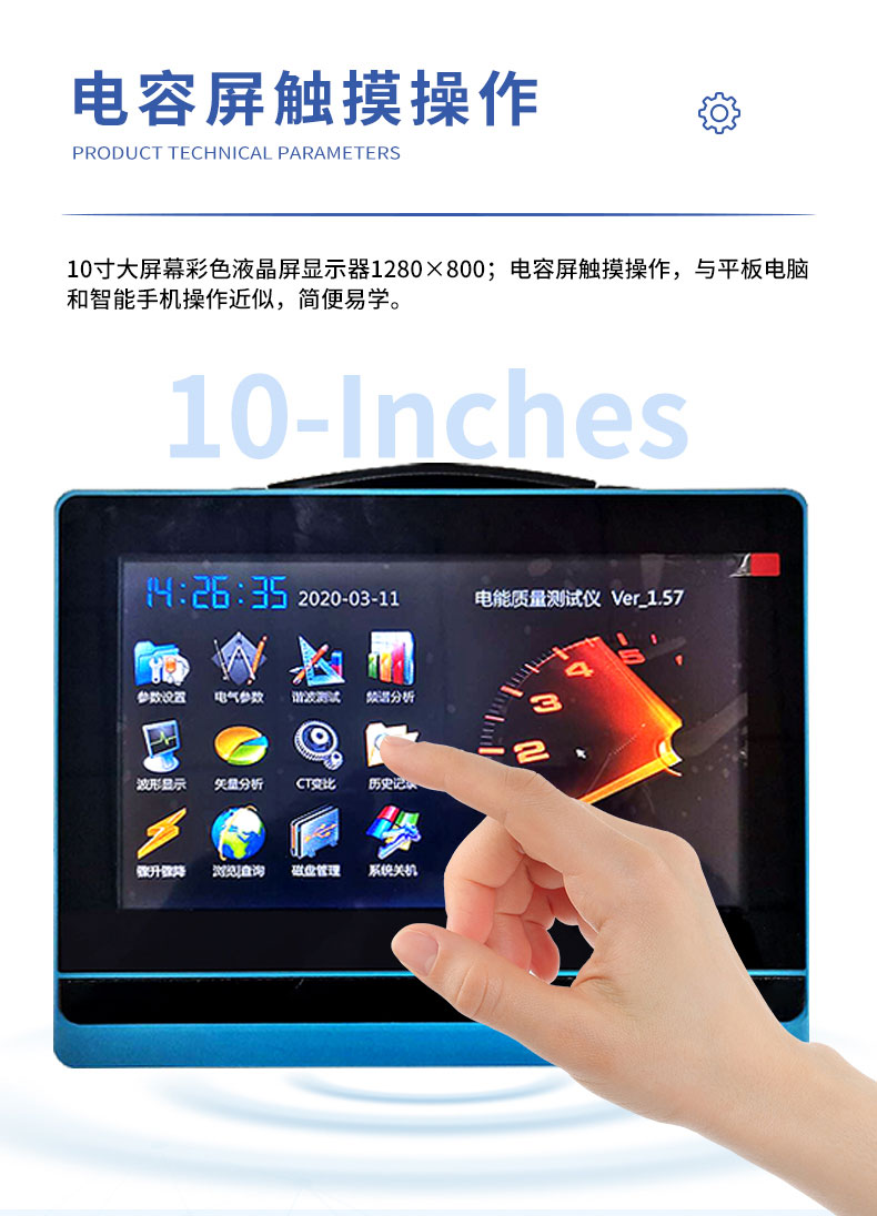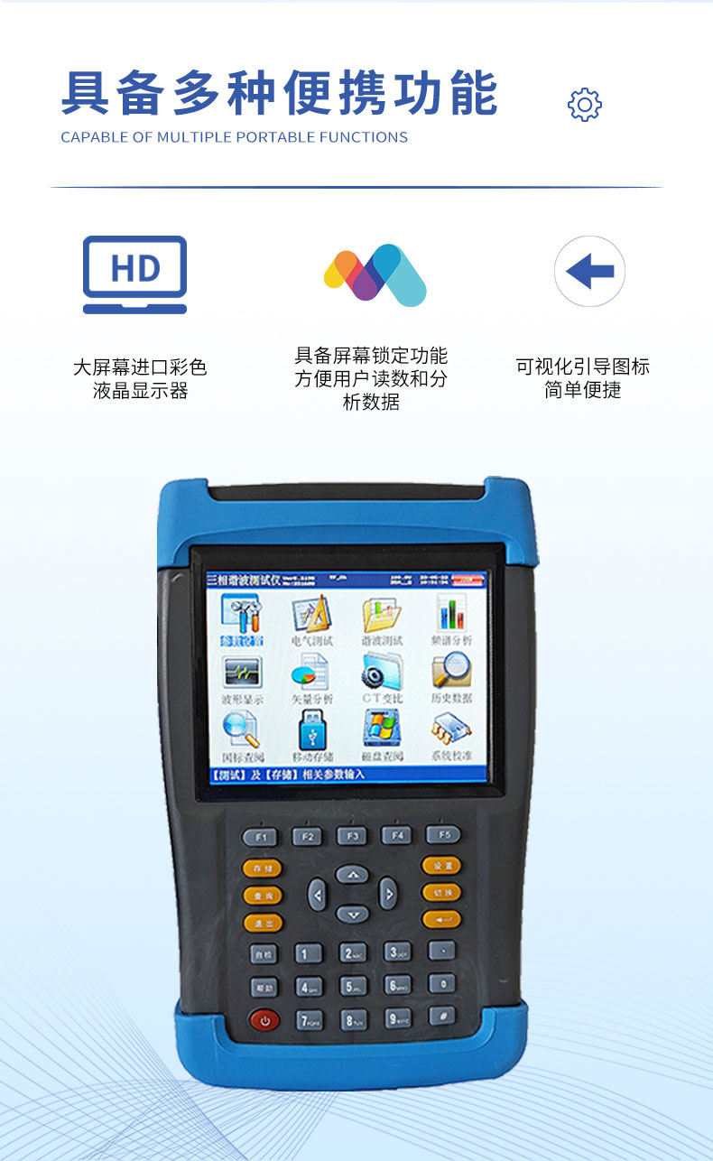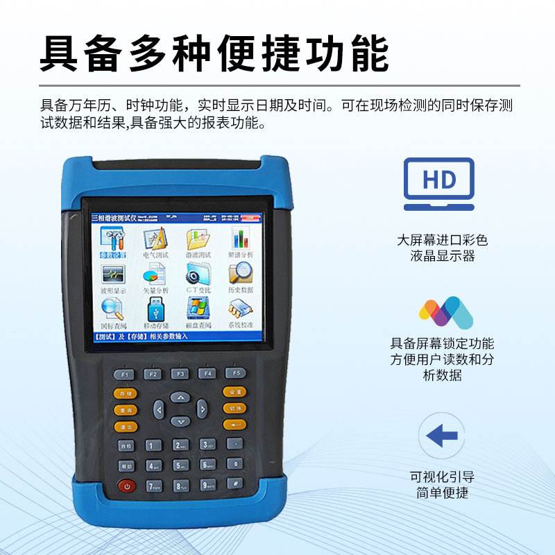6.可显示单相电压、电流波形并可同时显示三相电压、电流波形。7.所有测试界面具备屏幕锁定功能,以方便用户读数和分析数据。