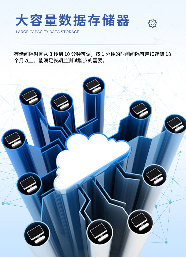 14.内置大容量数据存储器,存储间隔时间从3秒到10分钟可调;按1分钟的时间间隔可连续存储18个月以上,能满足长期监测试验点的需要。