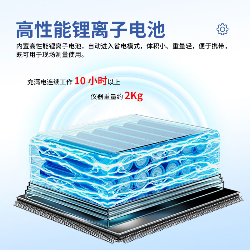 24、内置高性能锂离子电池,自动进入省电模式,可使仪器在无外接电源的情况下持续工作10小时以上,方便现场测试;