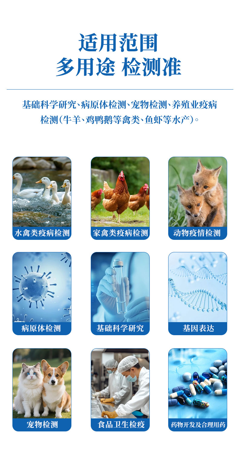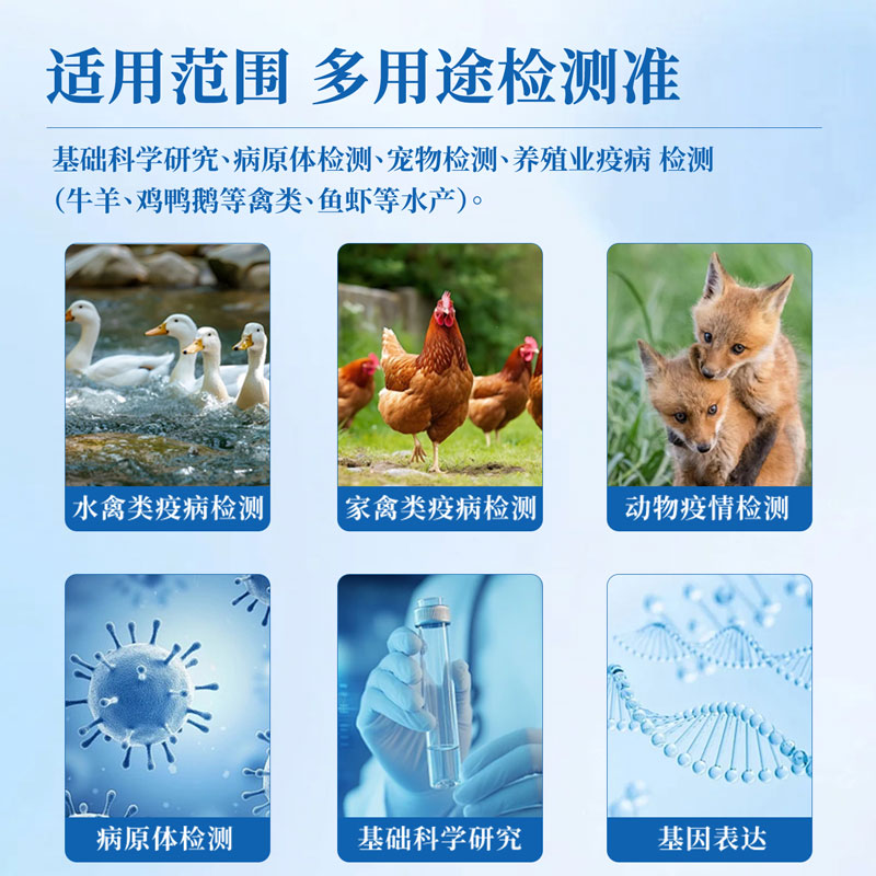 基础科学研究、病原体检测、宠物检测、养殖业疫病检测(牛羊、鸡鸭鹅等禽类、鱼虾等水产)