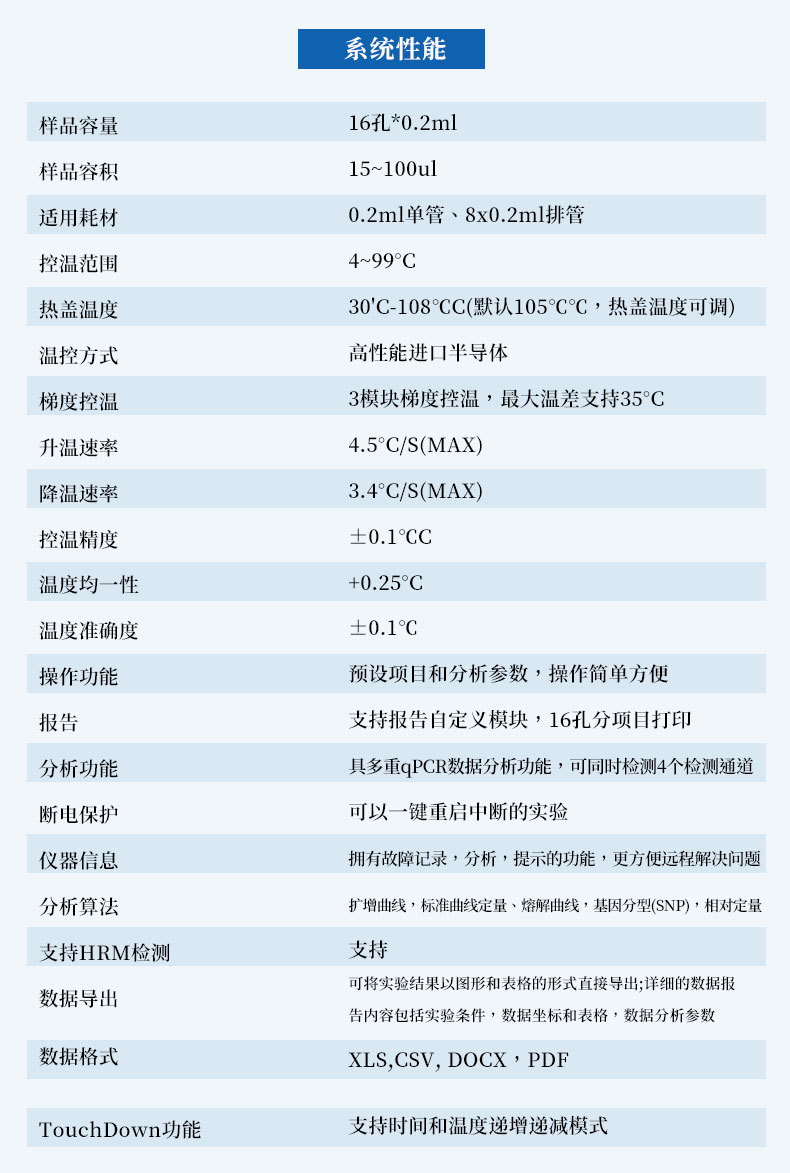 | 分析算法 | 扩增曲线,标准曲线定量、熔解曲线,基因分型(SNP),相对定量 |