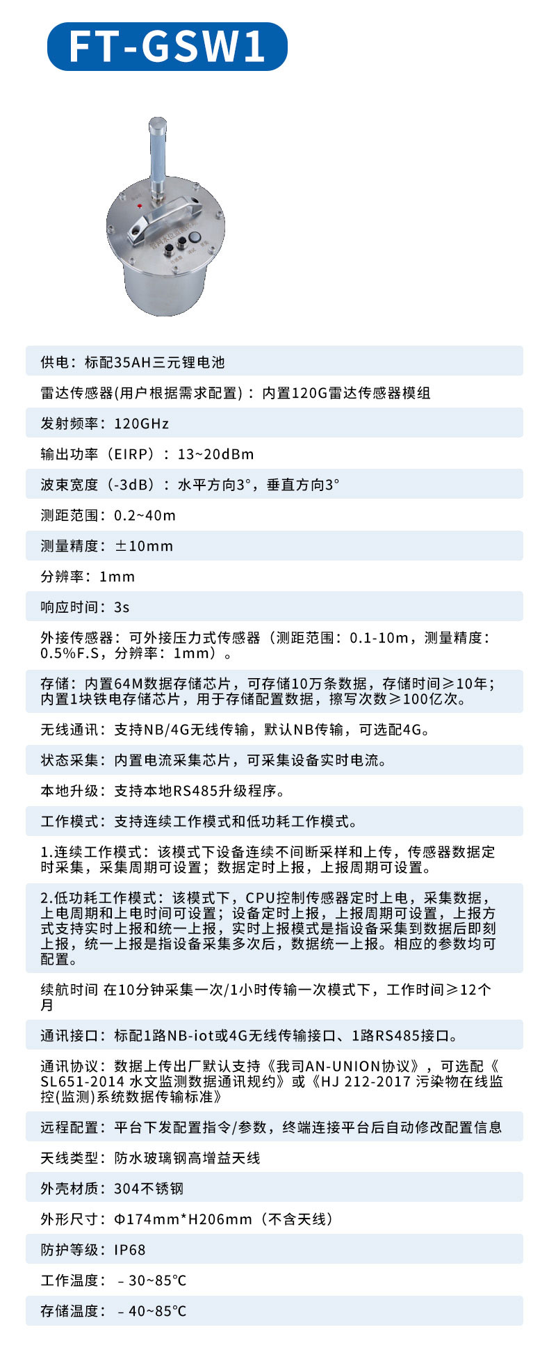 【产品简介】一、一体式管网液位计产品简介GSW1系列一体式液位计采用了雷达与压力一体式的设计,可同时选用雷达、压力或选用其中一种水位传感器,雷达测量采用目前先进的测距模式—FMCW调频连续波模···