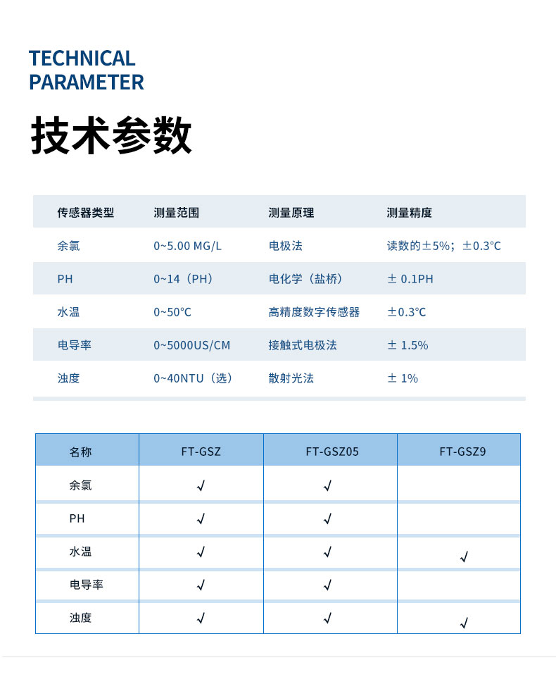 | 4 | 浊度 | 0~40NTU(选) | 散射光法 | ±1% |