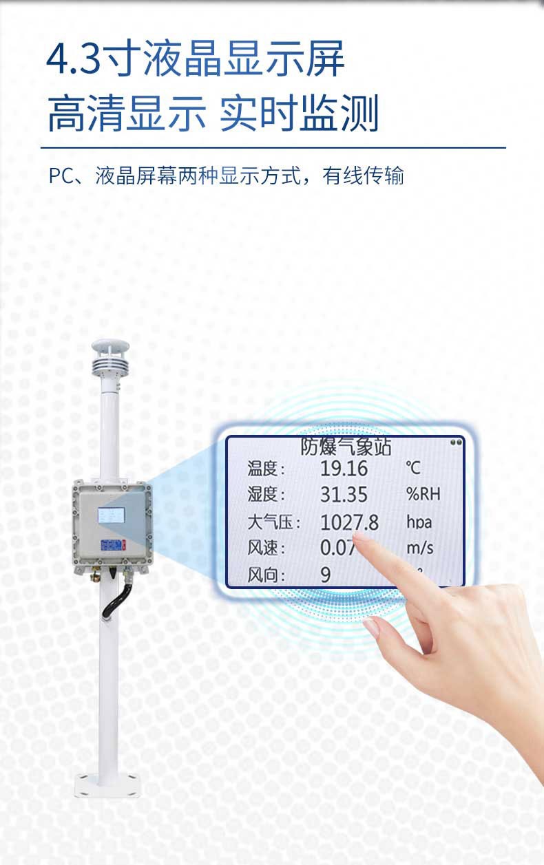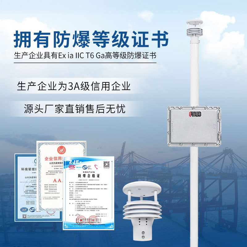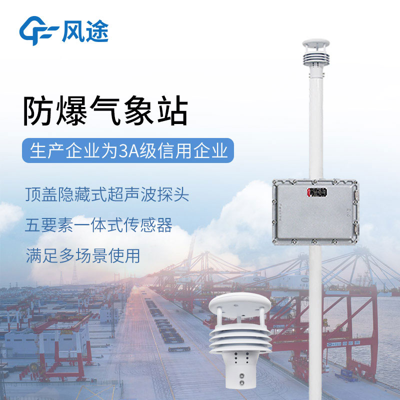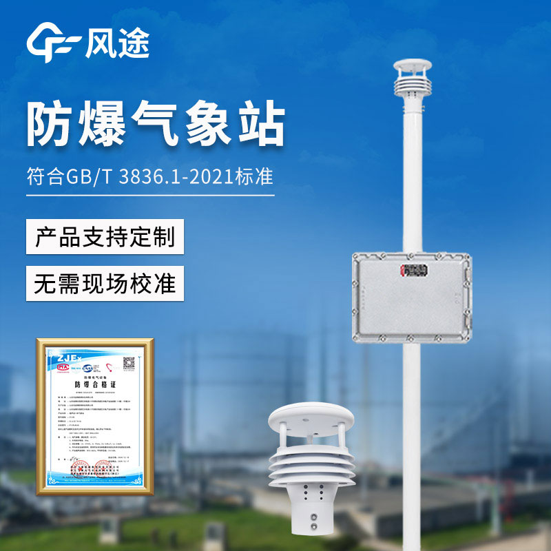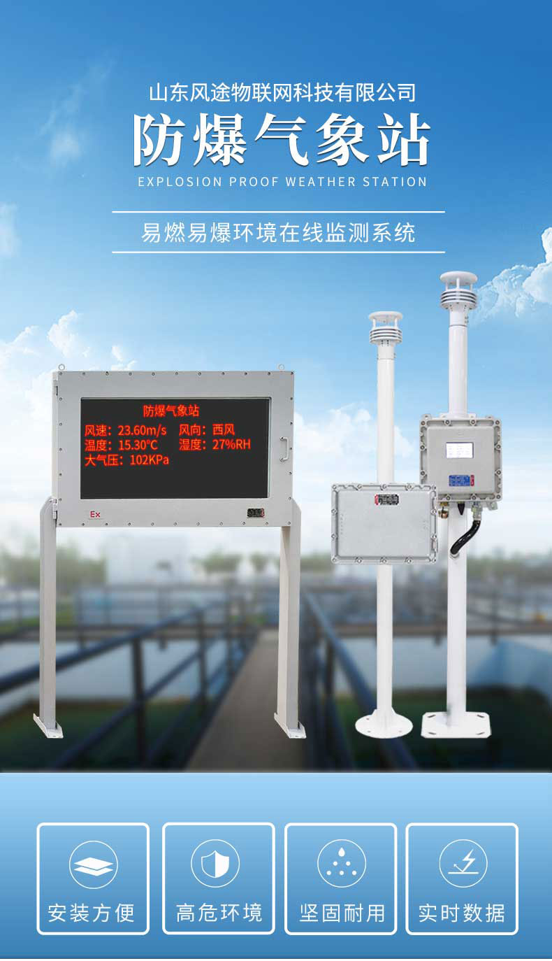 防爆气象站是风途物联网根据市场需求,针对化工厂、油库等特殊场所而研发生产的一款一体化气象站。它集数据采集、存储、通讯上传于一体,通过有线的通讯方式与后台上位机管理软件或者中控室PLC、DCS对接,进行数据的处理分析。