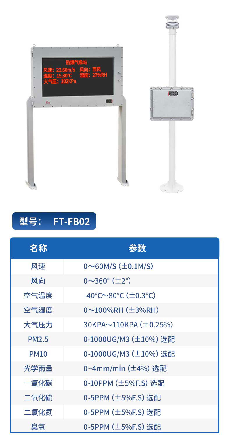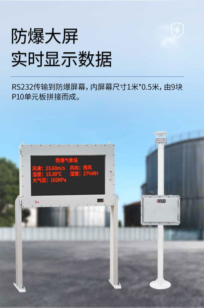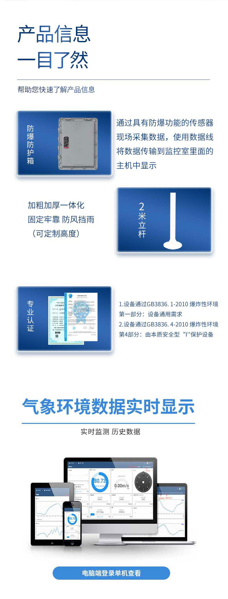 【产品简介】一、防爆气象站产品简介防爆气象站是风途物联网根据市场需求,针对化工厂、油库等特殊场所而研发生产的一款一体化气象站。它集数据采集、存储、通讯上传于一体,通过有线的通讯方式与后台上位机···