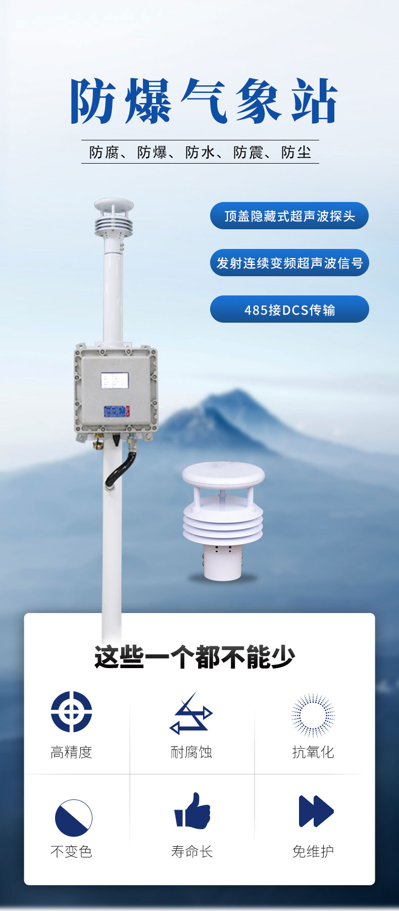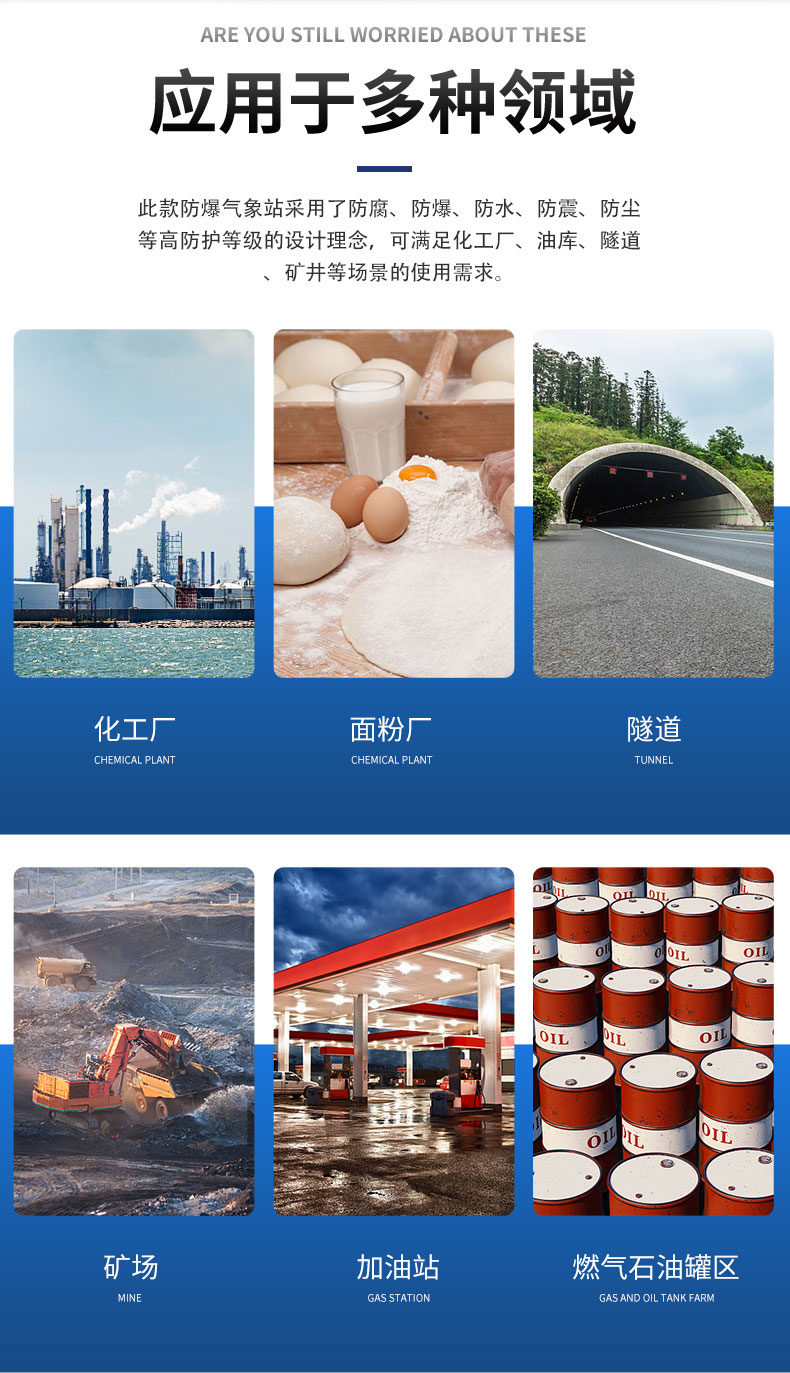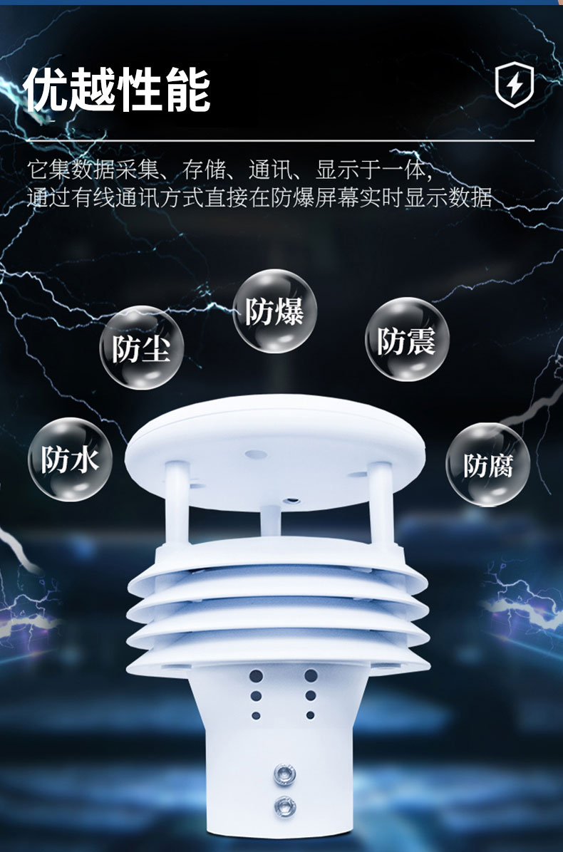此款液晶屏防爆气象站采用了防腐、防爆、防水、防震、防尘等高防护等级的设计理念,可满足化工厂、油库、隧道、矿井等场景的使用需求。