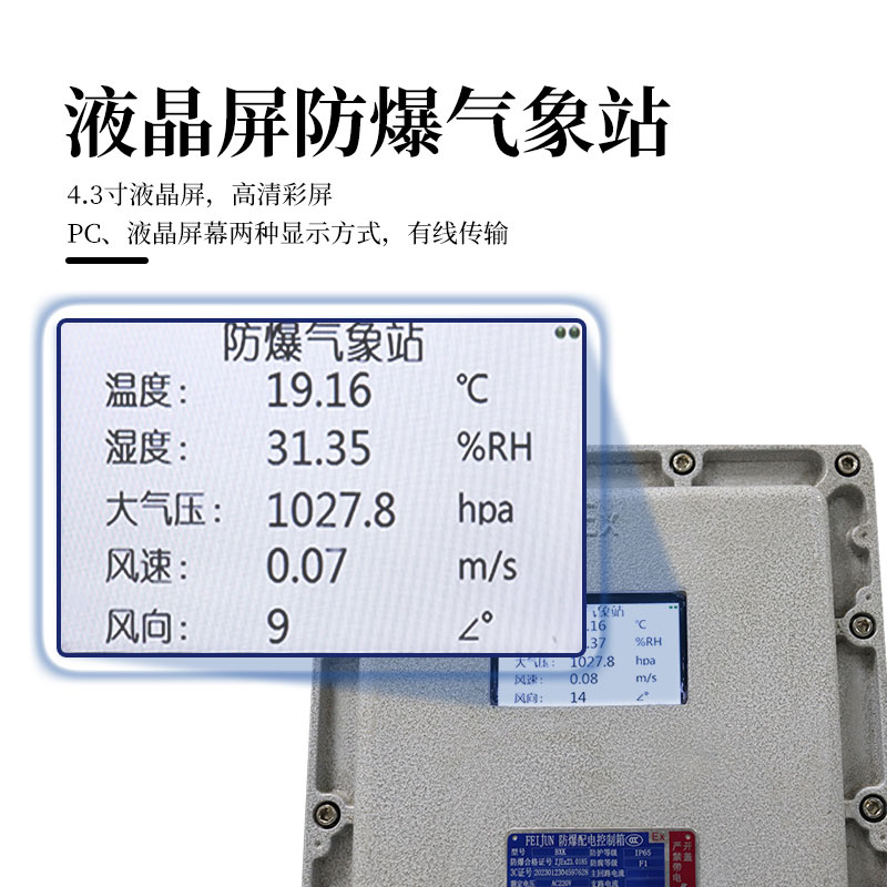 【产品简介】一、液晶屏防爆气象站产品简介FB01S型液晶屏防爆气象站是我司根据市场需求,针对化工厂、油库等特殊场所而研发生产的一款一体化气象站。它集数据采集、存储、显示、通讯于一体,通过有线的···