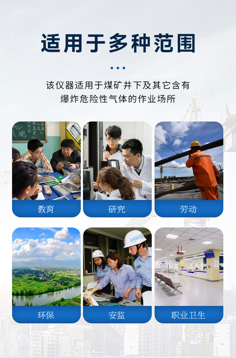 防爆粉尘检测仪(以下简称测量仪)是以红外光吸收法原理,一种用于测定环境空气中浮游粉尘浓度的仪器。该仪器根据MT163—1997《直读式粉尘浓度测量仪表通用技术条件》和Q/320582YLA013-2016《CCZ1000直读式粉尘浓度测量仪》技术条件及GB3836-2010标准中ExibI等级(本质安全型)防爆设计粉尘浓度测量仪器,该仪器的呼吸分离装置的分离效能完全符合国际公认的"BMRC"曲线要求,能准确及时地反映接尘人员吸入的呼吸性粉尘质量和不同粉尘作业场所中粉尘的污染状况,为准确评价作业场所的卫生状况提供可靠数据,该仪器适用于煤矿井下及其它含有爆炸危险性气体的作业场所。