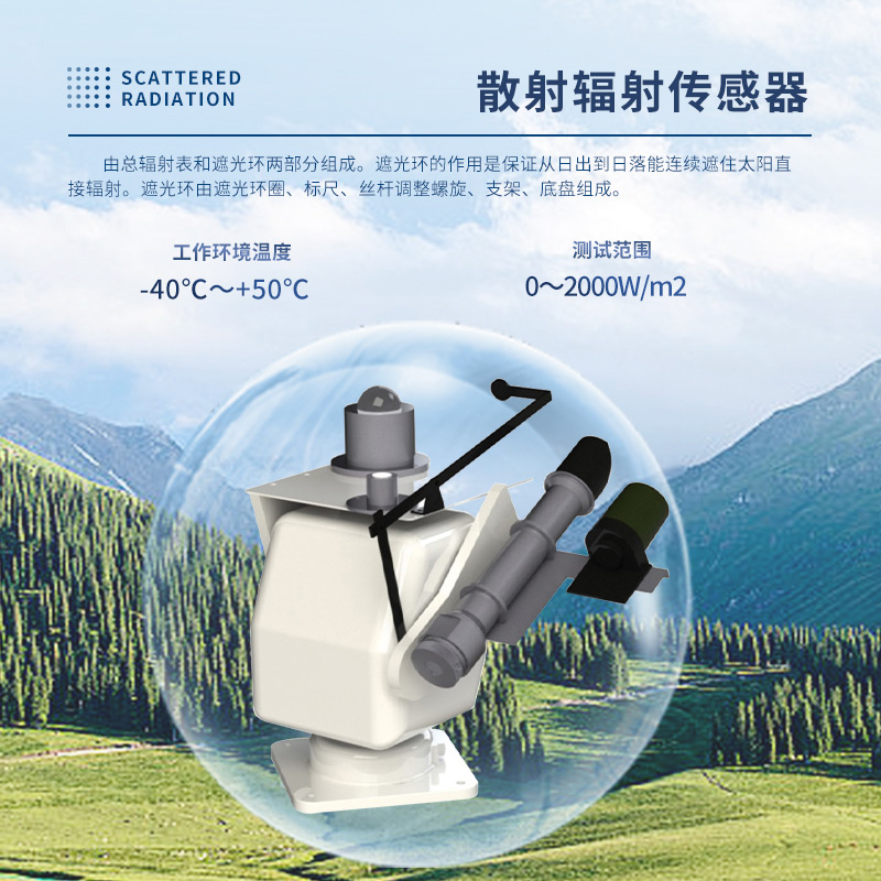 【产品简介】太阳散辐射传感器由总辐射表和遮光环两部分组成。遮光环的作用是保证从日出到日落能连续遮住太阳直接辐射。遮光环由遮光环圈、标尺、丝杆调整螺旋、支架、底盘组成。遮光环圈的宽度为65mm,···