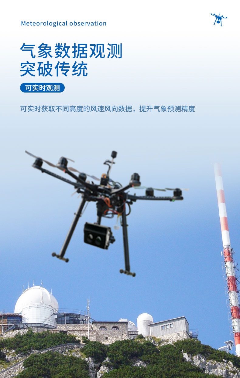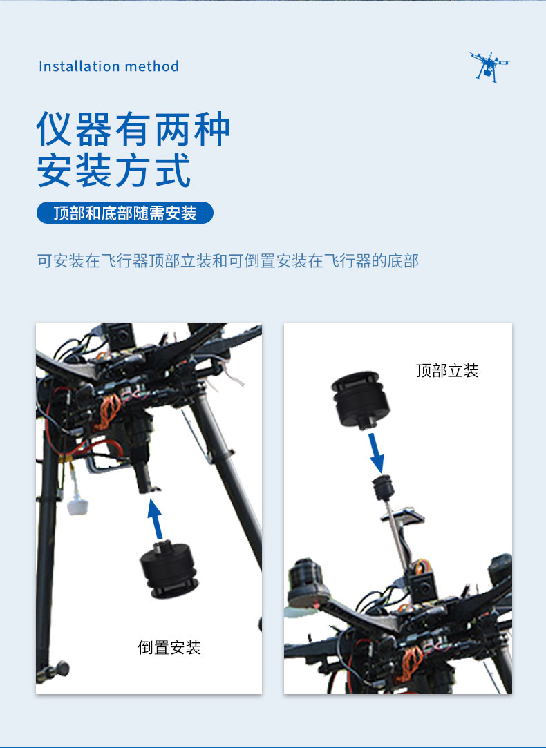 该气象仪即可安装在无人机顶部,也可吊装在机腹。材料选择重量轻和坚固的工程ABS材料,也可选择轻质铝合金。可根据用户需要的参数,选择单独参数的检测模块,也可任意组合。