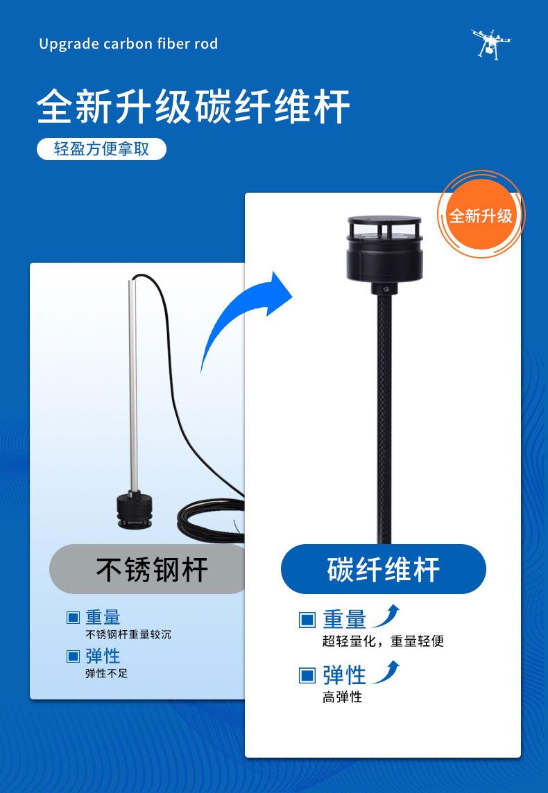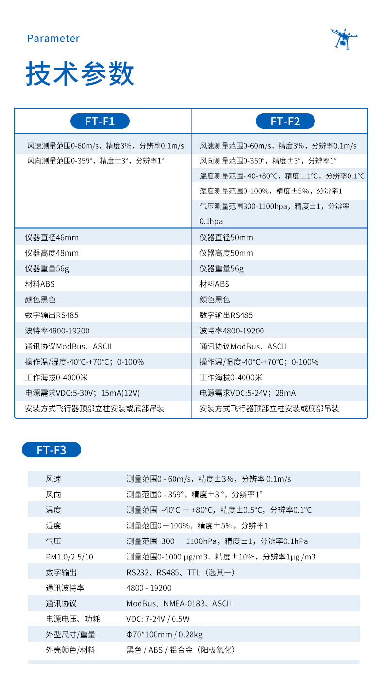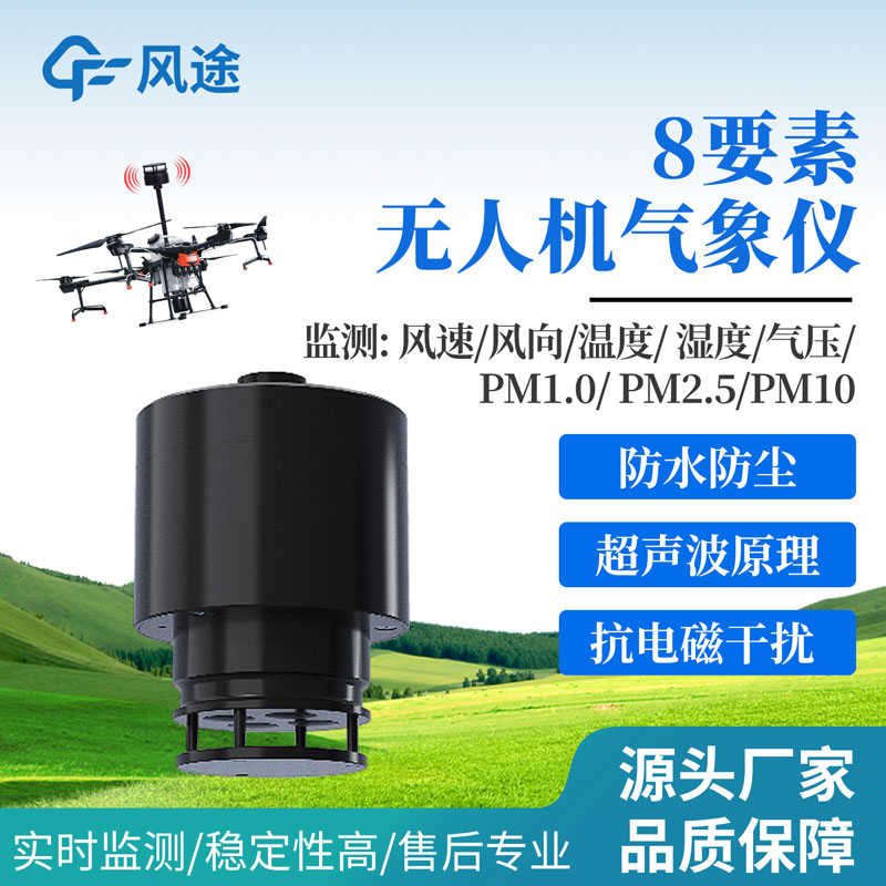 F3八参数无人机气象仪可测的气象参数包括:风速、风向、温度、湿度、气压、PM1.0、PM2.5、PM10等。采用一体化结构,为搭载在无人机平台上而设计制造,优先考虑重量轻、体积小、风阻小和功耗低等特点,可在小雨气象环境下正常工作。