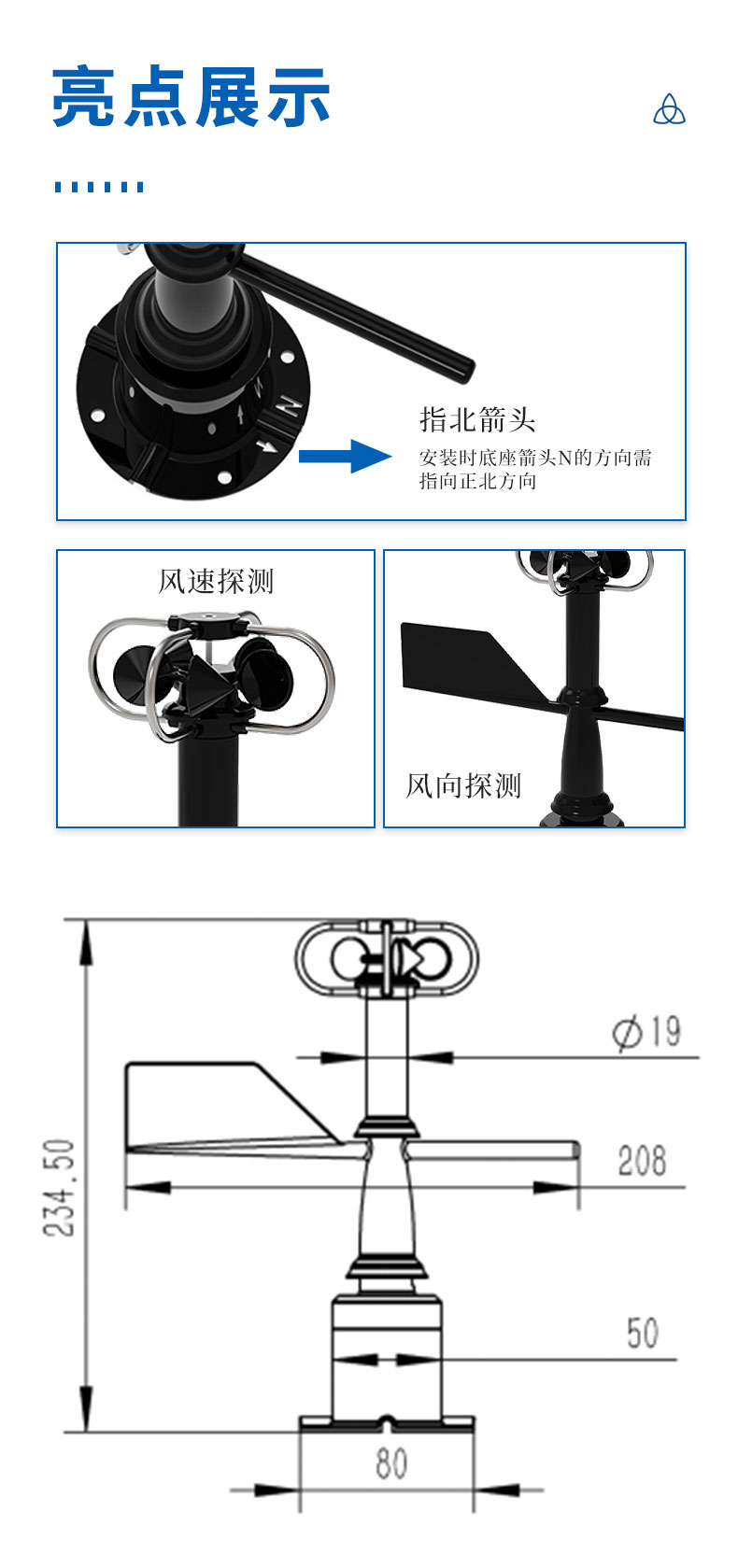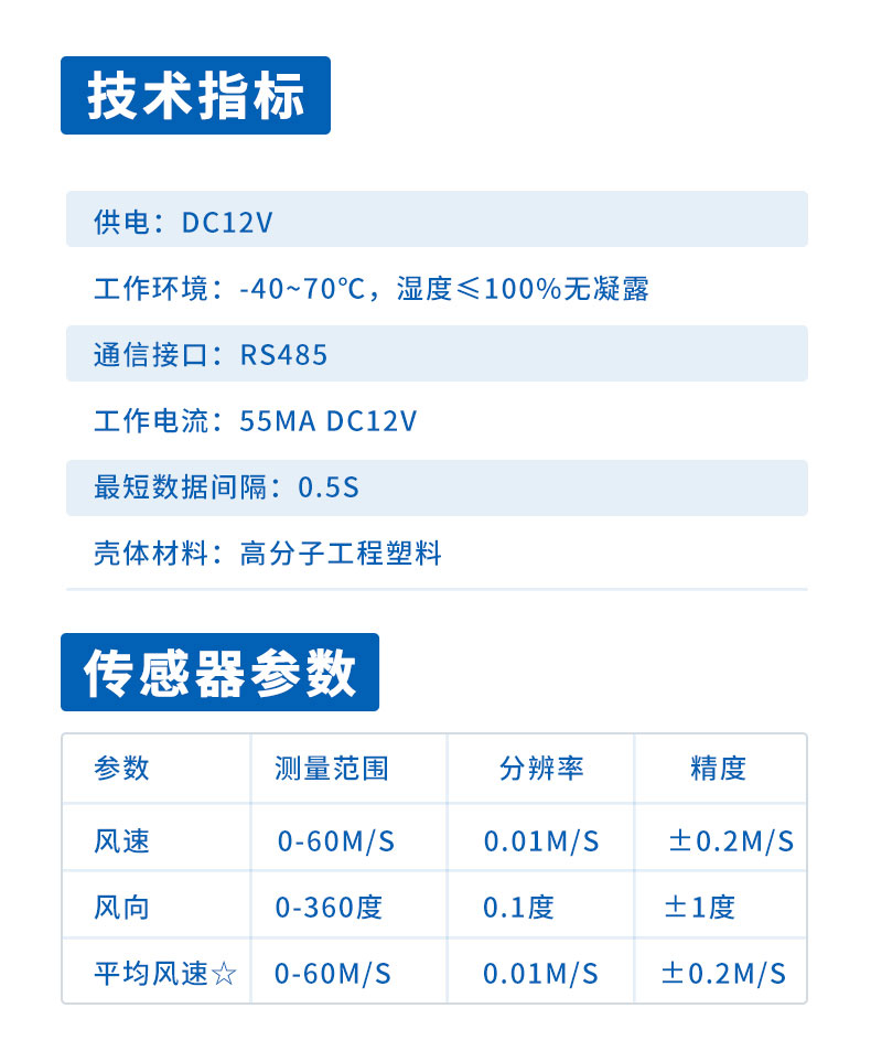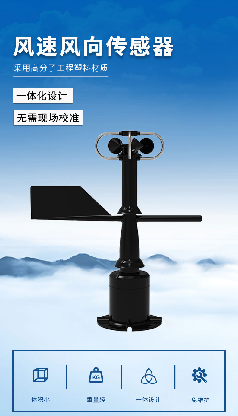 【产品简介】一、机械一体式风速风向传感器技术指标供电:DC12V工作环境:-40~70℃,湿度≤100%无凝露通信接口:RS485工作电流:55mA DC12V启动风速:0.5m/s最短数据间···