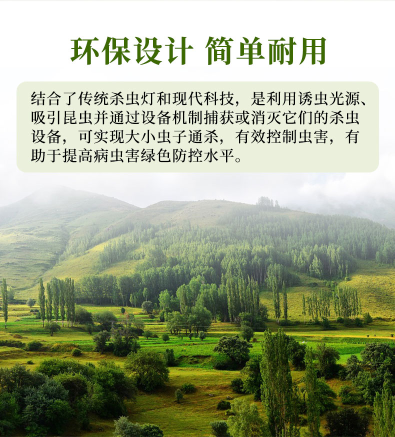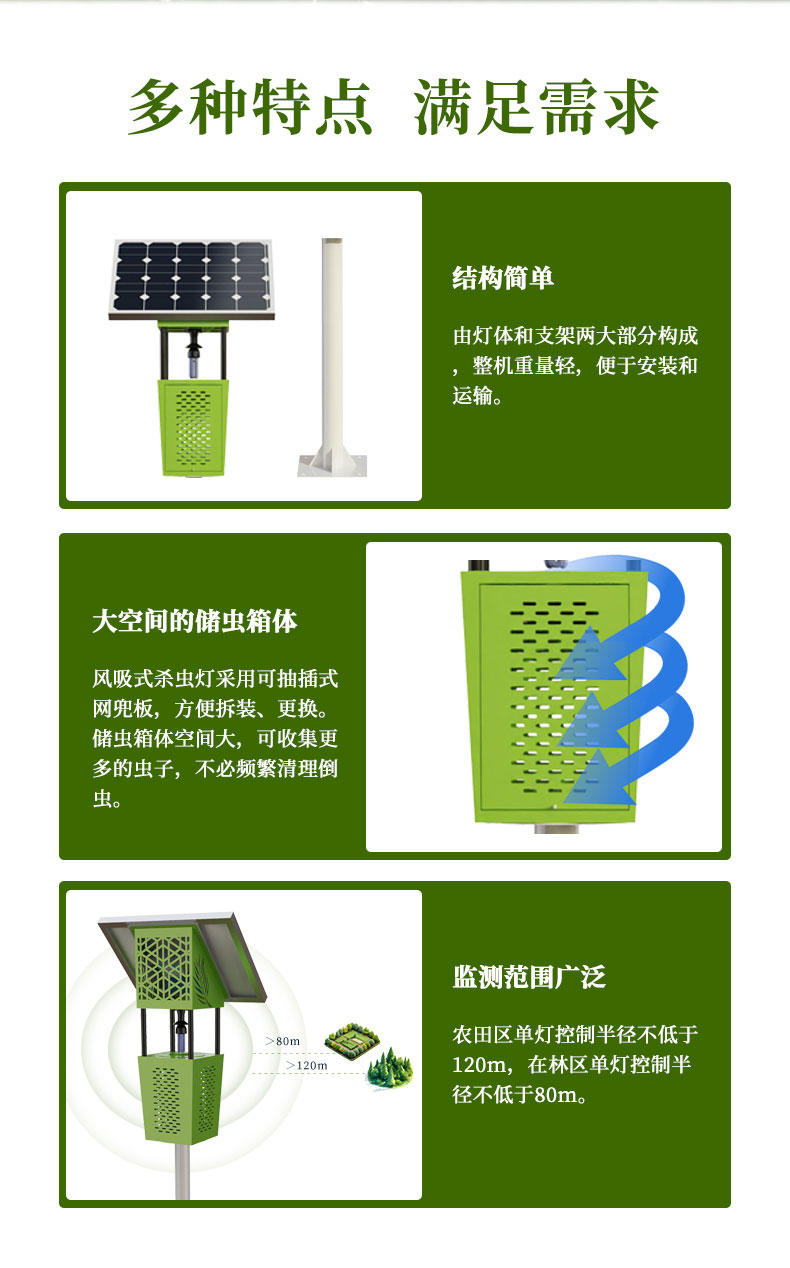 1.采用诱虫光源风吸负压式杀虫,不受虫体大小影响,杀虫种类多,范围广。