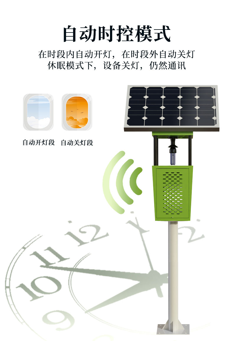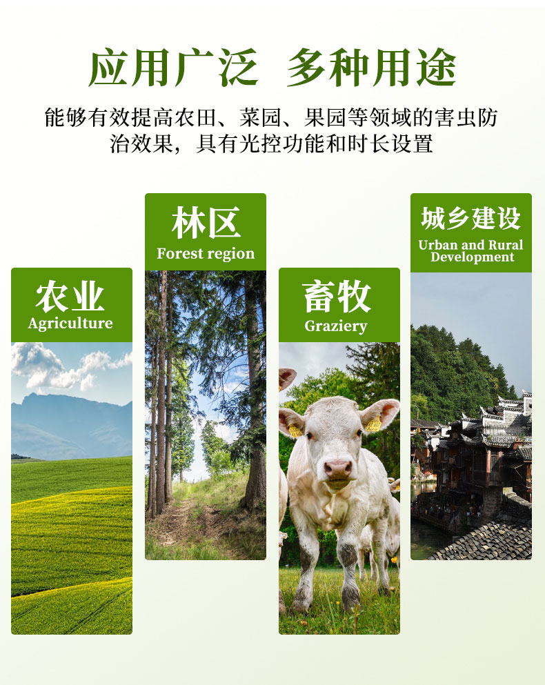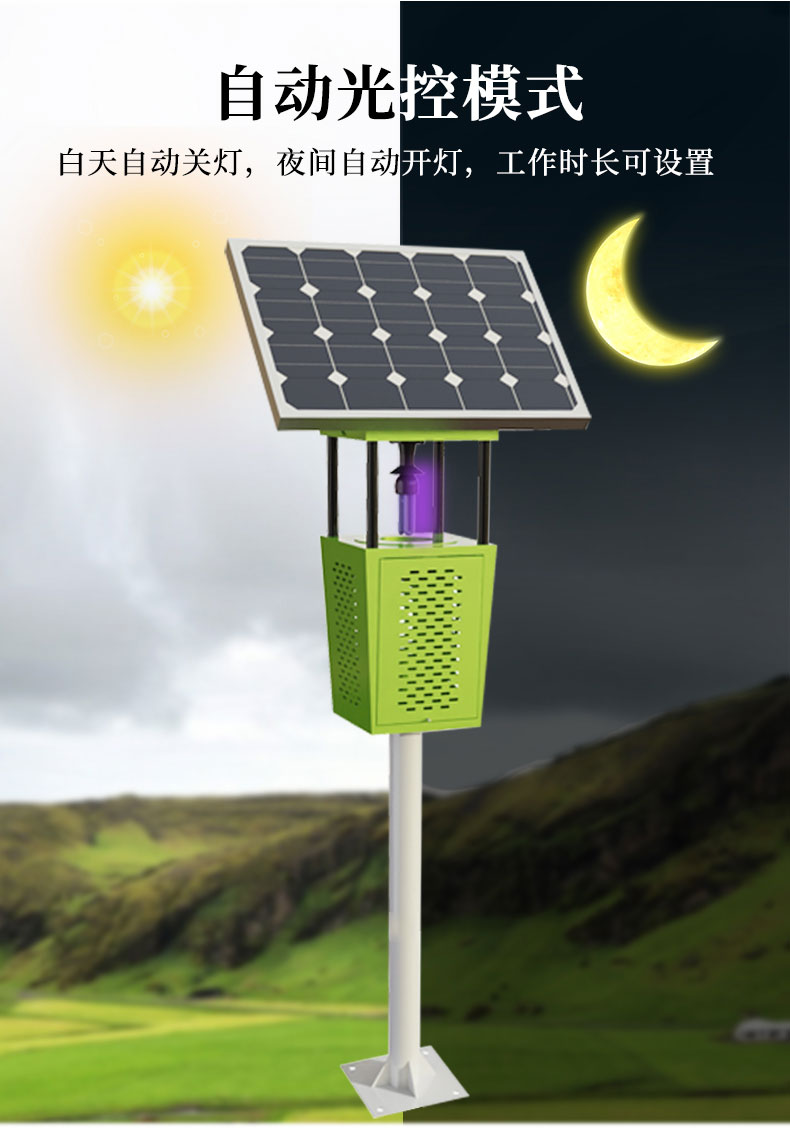 太阳能杀虫灯可广泛用于农业、林业及园艺、畜牧、城乡环境卫生中,还能够有效提高农田、菜园、果园等领域的害虫防治效果,具有光控功能和时长设置。