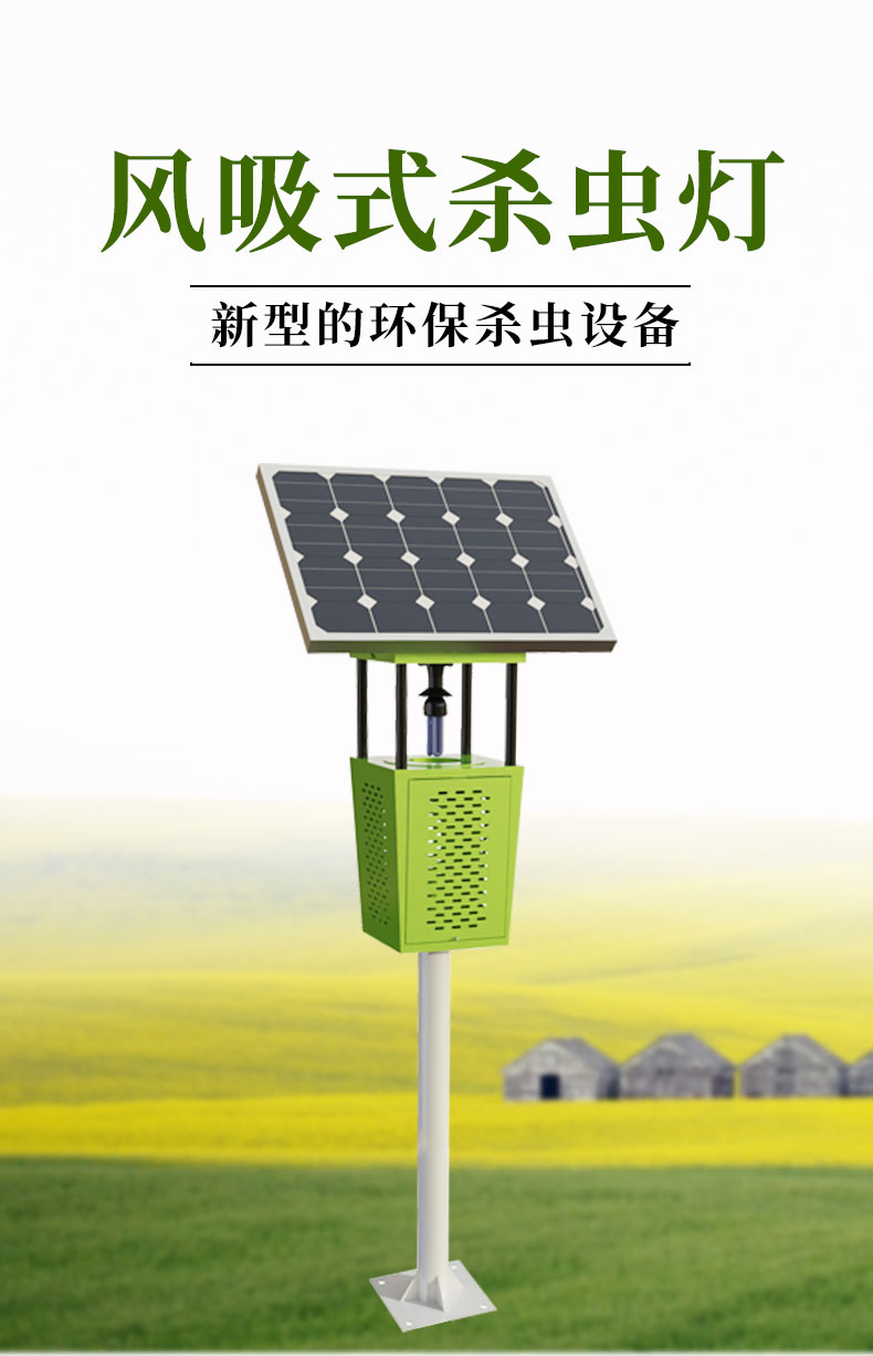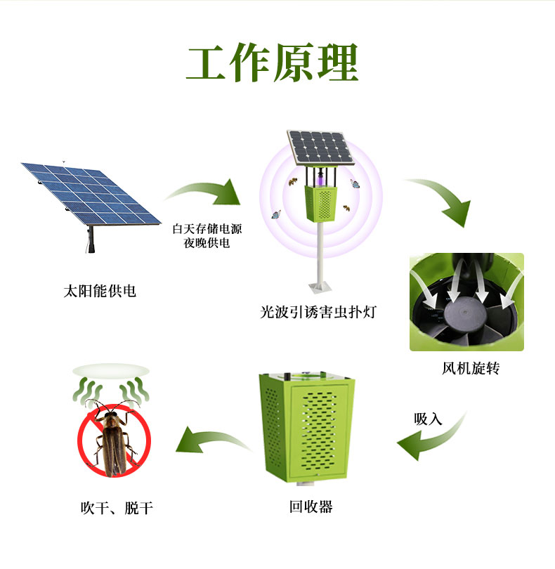 太阳能杀虫灯运用光波引诱害虫扑灯,随后风机旋转造成负压力气旋将小虫子吸进到回收器中,使之吹干、脱干,做到灭虫的目的,以太阳能发电板为基础,白天存储电源,夜晚为杀虫灯给予电源,引诱害虫扑向光源。