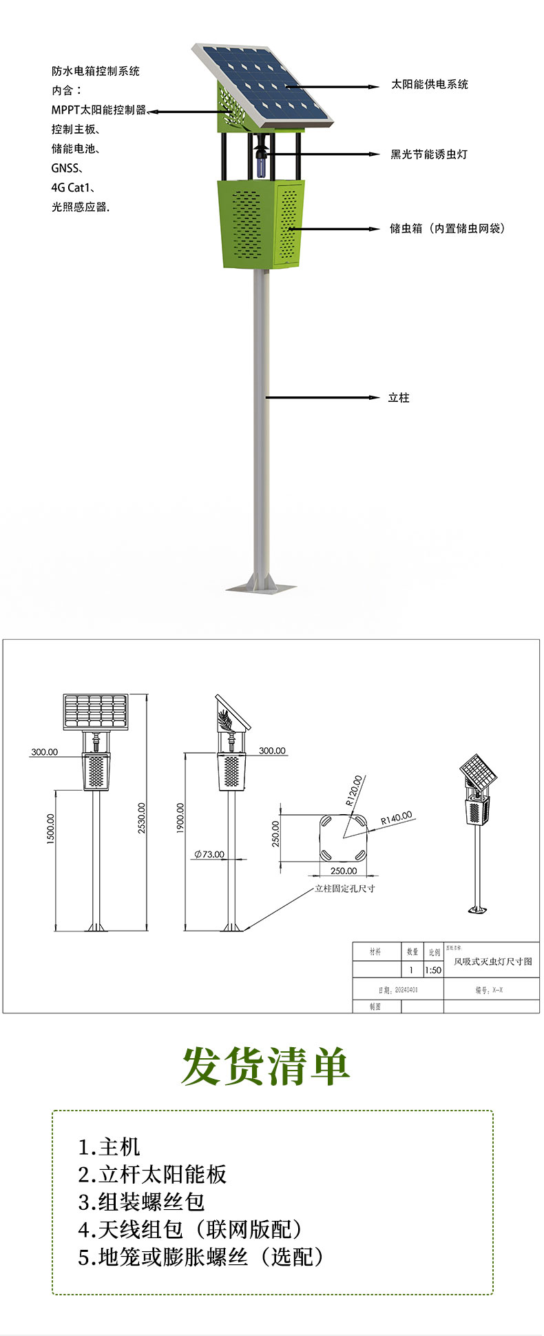 主机、立杆、太阳能板、组装螺丝包、天线组包(联网版配)、地笼或膨胀螺丝(选配)