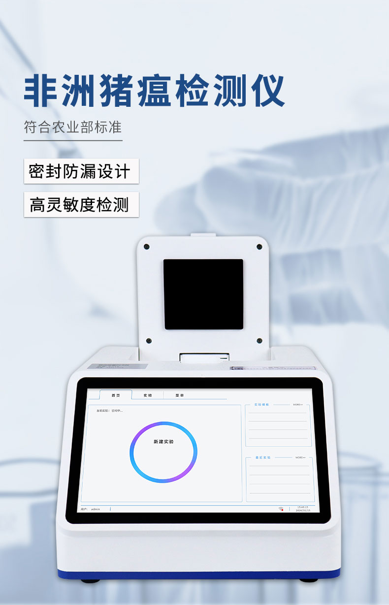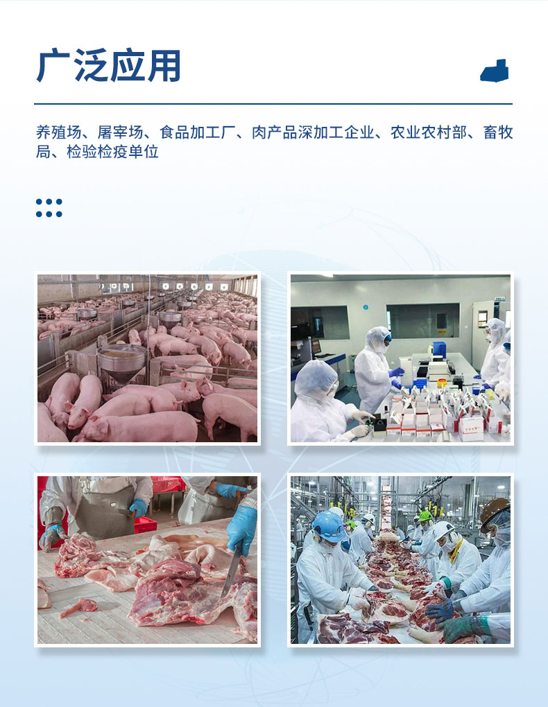 四通道16孔非洲猪瘟检测仪配套非洲猪瘟病毒荧光pcr检测试剂盒、非洲猪瘟病毒荧光pcr核酸检测试剂盒均已经获得农业农村部产品批准,可以满足非洲猪瘟核酸现场快速检测需求。可定量快速畜牧类疾病诊断如非洲猪瘟、禽流感、猪瘟、猪蓝耳、伪狂犬等疾病,广泛应用于养殖场、屠宰场、食品加工厂、肉产品深加工企业、农业农村部、畜牧局、检验检疫单位使用。