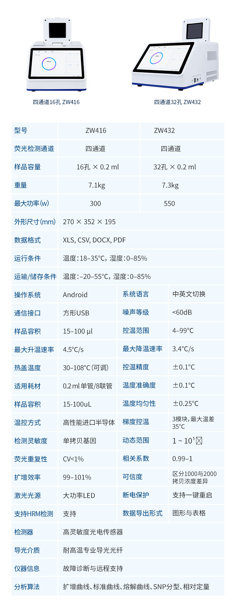 | 分析算法 | 扩增曲线,标准曲线定量、熔解曲线,基因分型(SNP),相对定量 |