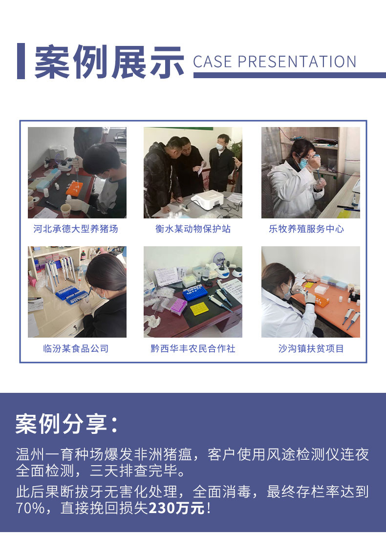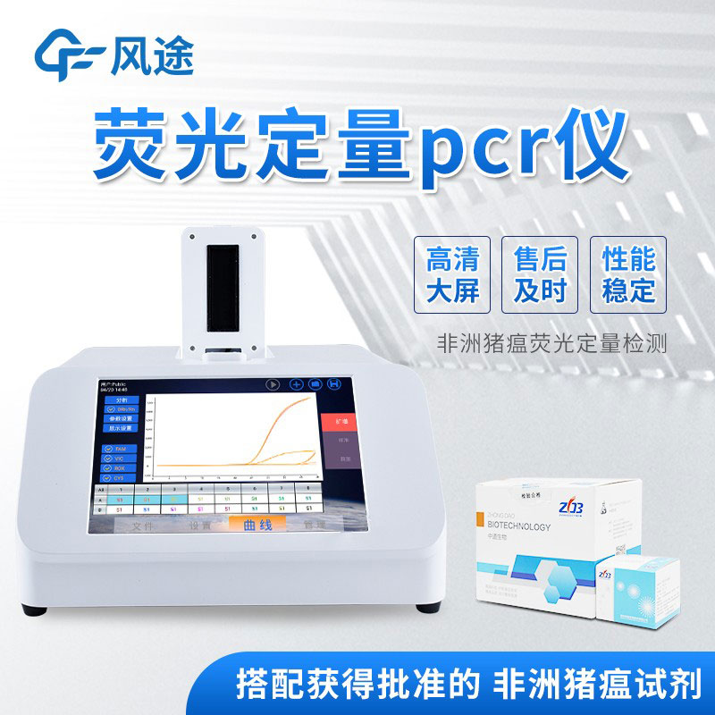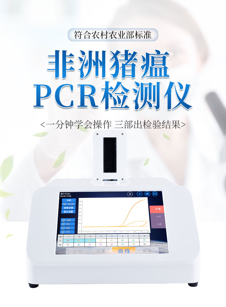 非洲猪瘟检测仪配套非洲猪瘟病毒荧光pcr检测试剂盒、非洲猪瘟病毒荧光pcr核酸检测试剂盒均已经获得农业农村部产品批准,可以满足非洲猪瘟核酸现场快速检测需求。可定量快速畜牧类疾病诊断如非洲猪瘟、禽流感、猪瘟、猪蓝耳、伪狂犬等疾病,广泛应用于养殖场、屠宰场、食品加工厂、肉产品深加工企业、农业农村部、畜牧局、检验检疫单位使用。