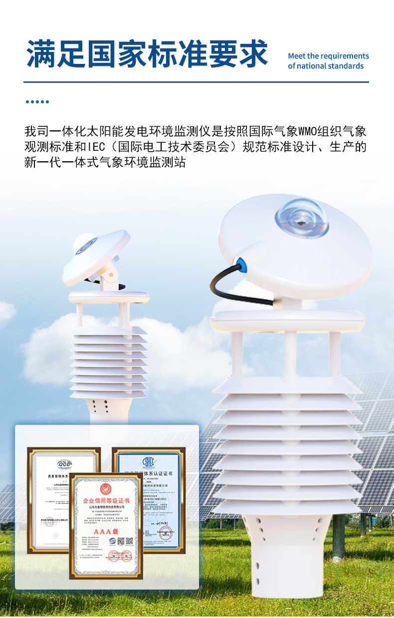 气象环境数据是决定太阳能发电的重要指标,对太阳能发电质量起着决定性作用;同时,也是对太阳能发电站的设计提供有效的数据保证,我司一体化太阳能发电环境监测仪是按照国际气象WMO组织气象观测标准和IEC(国际电工技术委员会)规范标准设计、生产的新一代一体式气象环境监测站。