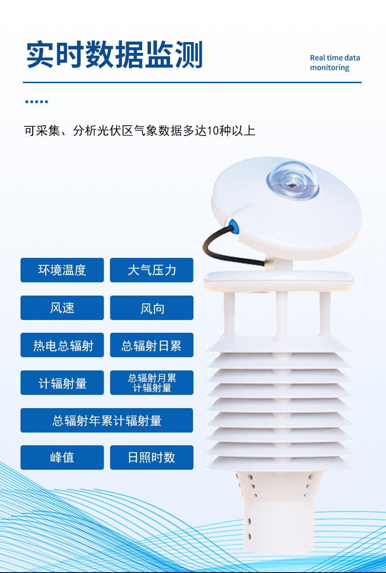 1.实时数据监测:可采集、分析光伏区气象数据多达10种以上,包括有环境温度、环境湿度、大气压力、风速、风向、热电总辐射、总辐射日累计辐射量、总辐射月累计辐射量、总辐射年累计辐射量、峰值日照时数等监测数据。
