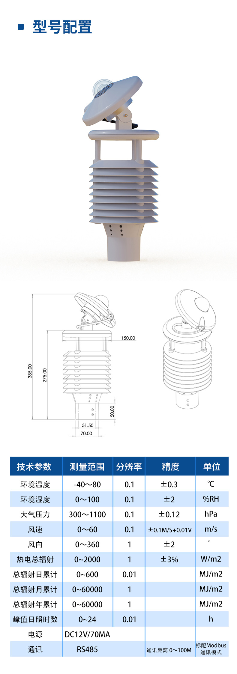 | 热电总辐射 | 0~2000 | 1 | ±3% | W/m2 |