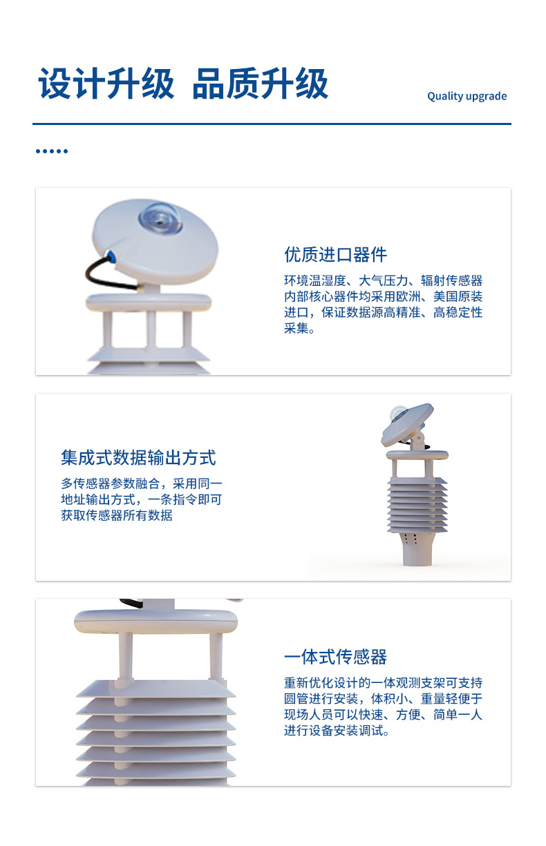 3.优质进口器件:环境温湿度、大气压力、辐射传感器内部核心器件均采用欧洲、美国原装进口,保证数据源高精准、高稳定性采集。