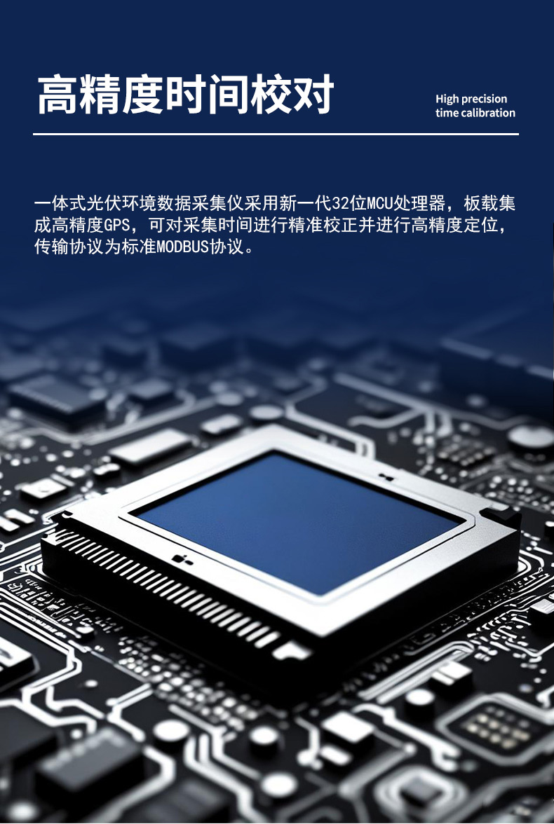 2.高精度时间校对:一体式光伏环境数据采集仪采用新一代32位MCU处理器,板载集成高精度GPS,可对采集时间进行精准校正并进行高精度定位,传输协议为标准MODBUS协议。