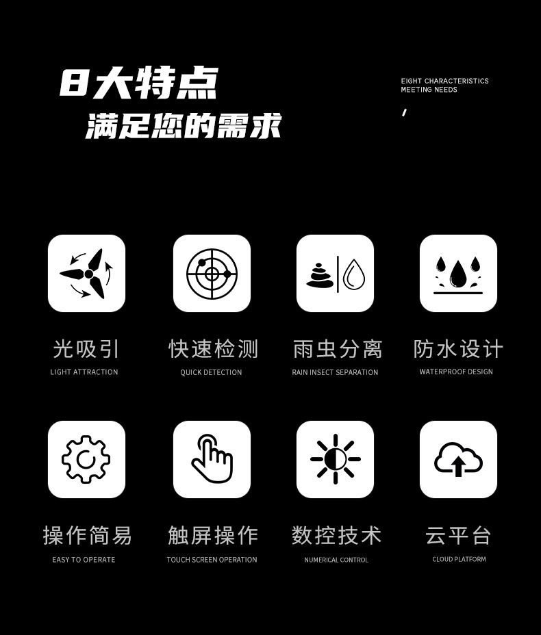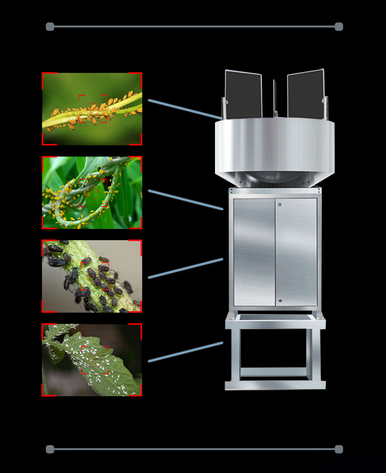 利用现代光,电,数控等技术,实现了害虫诱捕虫体高温杀虫,传送带配合运输,整灯自动运行等功能。在无人监管的情况下,可自动完成诱虫,杀虫,虫体分散,拍照,运输,收集,排水等系统作业,然后利用无线传输技术、物联网技术并实时将环境气象和虫害情况上传到指定农业云平台。